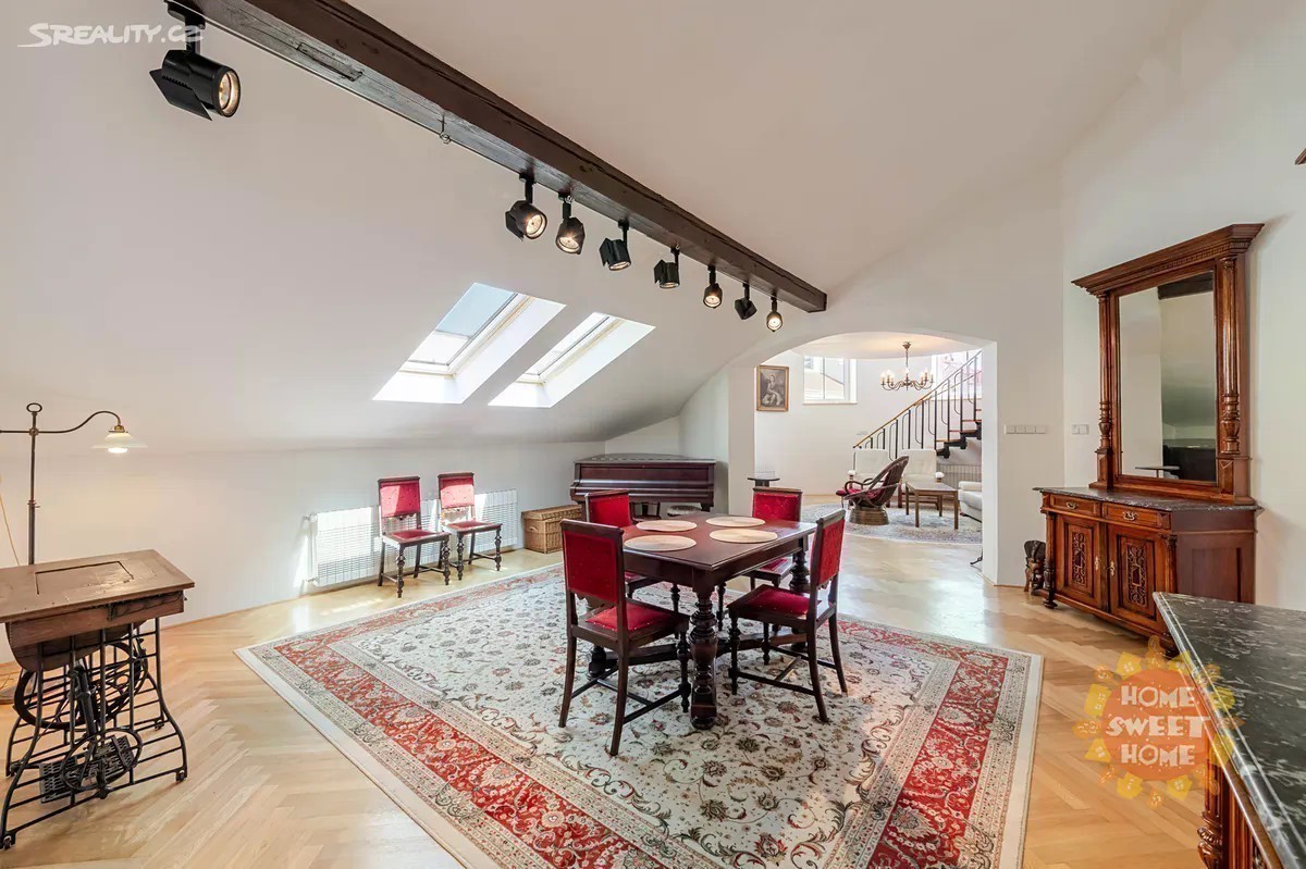 Nadstandardně prostorný podkrovní byt 6+2 s terasou k pronájmu o celkové rozloze 285m2 se nachází v 5. patře cihlového domu na Praze 2 - Vinohrady, v ulici Slezská v těsné blízkosti Náměstí Míru. 3 ložnicový byt, se 2 kuchyněmi, 2 koupelnami, 2 obývacími pokoji se rozkládá po celém patře. Výtah v patře je pouze k tomuto bytu. Byt je kompletně vybavený. Dispozičně vytváří 2 jednotky. Velkoryse pojaté dispoziční uspořádání nabízí prostornou halu, velký obývací pokoj s jídelním stolem a vstupem na terasu, kuchyni, hlavní ložnici s koupelnou a šatnou, a oddělenou toaletu. Druhou část bytu tvoří 2 ložnice, kuchyně, prostorná jídelna propojená s obývací pokojem a galerií, koupelna s vanou a pračkou a oddělená toaleta. V předsíni je umístěný nový kondenzační kotel. Na podlahách jsou dřevěné parkety a dlažba. Dům se nachází v atraktivní lokalitě pražských Vinohrad s vynikající dopravní dostupností i občanskou vybaveností v těsné blízkosti Náměstí Míru. V docházkové vzdálenosti jsou restaurace, obchody, školy, bankomaty, kavárny a stanice MHD a metra "A" Náměstí Míru. Byt je ihned dostupný k pronájmu.