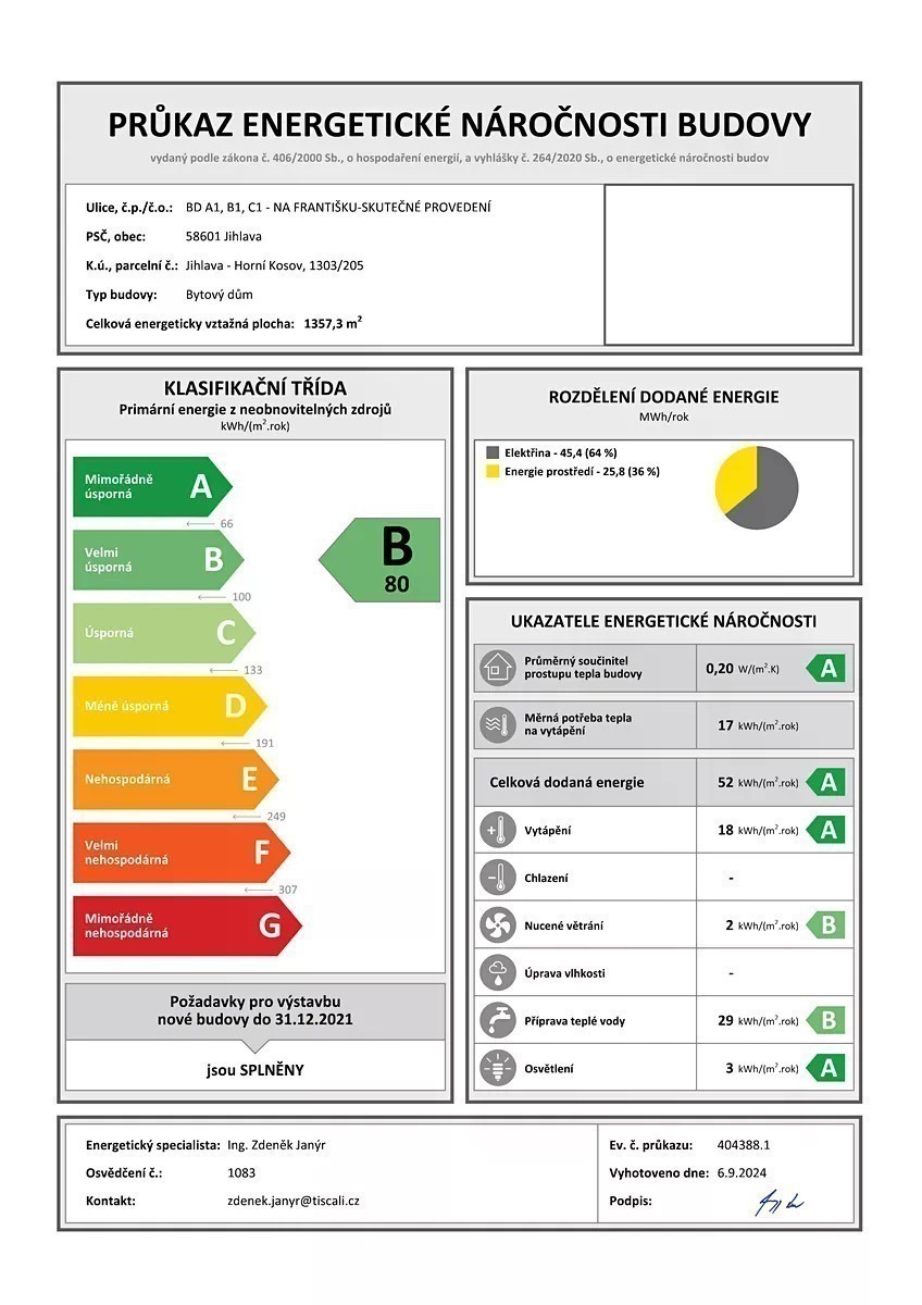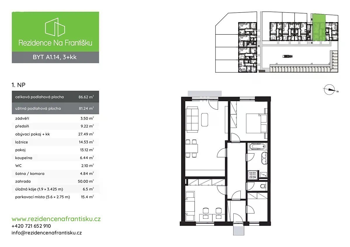 Slunný byt 3+kk se zahradou, garážovým stáním a úložnou kójí - 1. NP, budova A Nabízíme ke koupi moderní byt 3+kk (označení A1.14) o celkové ploše 86,62 m², který se nachází v přízemí (1. NP) budovy A. K bytu náleží prostorná zahrada o výměře 50 m², orientovaná na jihozápad, ideální pro odpočinek i rodinné grilování. Dispozice bytu: Obývací pokoj s kuchyňským koutem - 27,49 m² Ložnice - 14,53 m² Pokoj - 13,12 m² Předsíň a zádveří - 12,72 m² Koupelna a samostatné WC - 8,54 m² Šatna/komora - 4,84 m² Byt je vybaven komfortním elektrickým podlahovým vytápěním. V ceně je zahrnuto také vyhrazené podzemní parkovací stání (15,4 m²) a úložná kóje (6,5 m²) - ideální pro kola, sportovní vybavení či sezónní věci. Standardy bytu jsou provedeny v moderním stylu - kompletní přehled je k dispozici na vyžádání. Neváhejte a domluvte si prohlídku - tento byt nabízí ideální spojení soukromí, pohodlí a výhodné polohy.