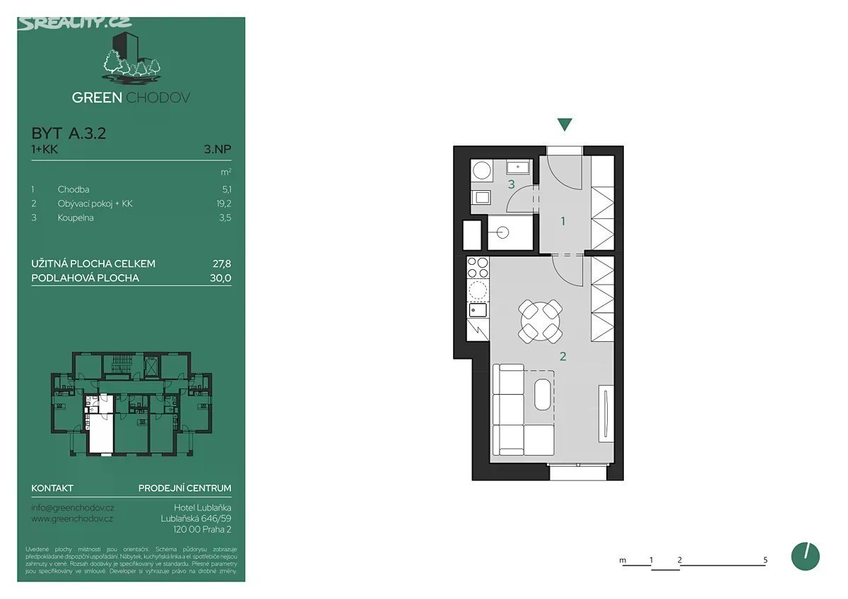 Green Chodov: Exkluzivní bydlení a investice v Praze. Představujeme vám rezidenční projekt Green Chodov, který nabízí moderní bydlení v atraktivní a klidné lokalitě Prahy. Projekt je navržen tak, aby spojoval komfort městského života s harmonií přírody. Bytové jednotky 1+kk jsou navrženy pro maximální komfort a praktičnost včetně dispozic jednotlivých místností. Mimořádná lokalita a skvělá dostupnost. Green Chodov se nachází na pražském Chodově s rychlým a pohodlným přístupem do centra města. Přímo u projektu jsou dvě autobusové zastávky a metro je v docházkové vzdálenosti na stanicích Chodov a Roztyly. V budoucnu se plánuje také tramvajová trať, což dostupnost ještě vylepší. Navíc v pěší vzdálenosti najdete velký supermarket i nákupní centrum Westfield Chodov. Kvalitní bydlení i investiční příležitost. Projekt se skládá z 11podlažního bytového domu a 2podlažního polyfunkčního domu se společným podzemním parkováním. V nabídce jsou různé typy bytů, od malometrážních až po prostorné mezonetové byty, a také komerční a kancelářské prostory. Díky promyšlené dispozici je projekt atraktivní jak pro bydlení, tak pro investory hledající pasivní příjem z pronájmu či kapitálové zhodnocení. Příroda a klid na dosah ruky. Projekt je obklopen zelení a krásným vodním jezerem, které slouží jako ideální místo pro relaxaci. V blízkosti se nachází i park Trojmezí, jeden z největších přírodních parků v Praze. Nominace na ocenění a transparentní přístup. Rezidenční projekt Green Chodov byl nominován na ocenění Realitní projekt roku 2025 díky jedinečnému spojení architektury, přírody a vynikající dostupnosti. Za projektem stojí rodinný developer, pro kterého je prioritou kvalita, promyšlenost a spokojenost budoucích obyvatel. Nepropásněte tuto příležitost. Kontaktujte nás a zjistěte více o tomto exkluzivním projektu.