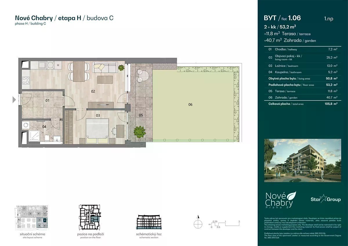 Moderní 2+kk s terasou 11,8 m² a zahradou 40,7 m² - nastěhování 2026 Hrubá stavba je již dokončena a svůj nový domov si můžete převzít v polovině roku 2026. Nabízíme exkluzivní byt 2+kk o velikosti 53,2 m², ke kterému náleží terasa o 11,8 m² se zahrádkou o 40,7 m². Byt se nachází v 1. podlaží komorního viladomu s pěti patry. K bytu lze dokoupit sklepní kóji (od 41.500 Kč/m² vč. DPH) a garážové stání v podzemí (520.000 Kč vč. DPH). Parkovací stání není podmínkou koupě bytu. Nové Chabry patří mezi nejvyhledávanější rezidenční projekty v Praze. Nabízejí moderní a bezpečné bydlení v sousedském stylu, s kompletní občanskou vybaveností přímo v areálu - mateřská škola, italská restaurace, vinotéka, obchody, fitness, komunitní centrum i výdejní boxy e-shopů. Základní škola je vzdálena jen 10 minut bezpečnou pěší cestou. Součástí areálu jsou cyklostezky, venkovní posilovna a dětská hřiště, zatímco kousek od domova najdete Ďáblický háj, Čimické a Drahanské údolí nebo aquacentrum Šutka. Do centra města se dostanete autem za 15 minut, autobusem za 5 minut na metro C - Kobylisy. V blízké budoucnosti navíc přibude nová tramvajová zastávka jen pár minut chůze od projektu. Pokud hledáte byt, který spojuje moderní design, soukromí a kompletní občanskou vybavenost, přijďte se podívat. Rádi vám představíme i další volné byty v projektu. *Zařízení interiéru na fotografiích a vizualizacích je pouze ilustrativní. *