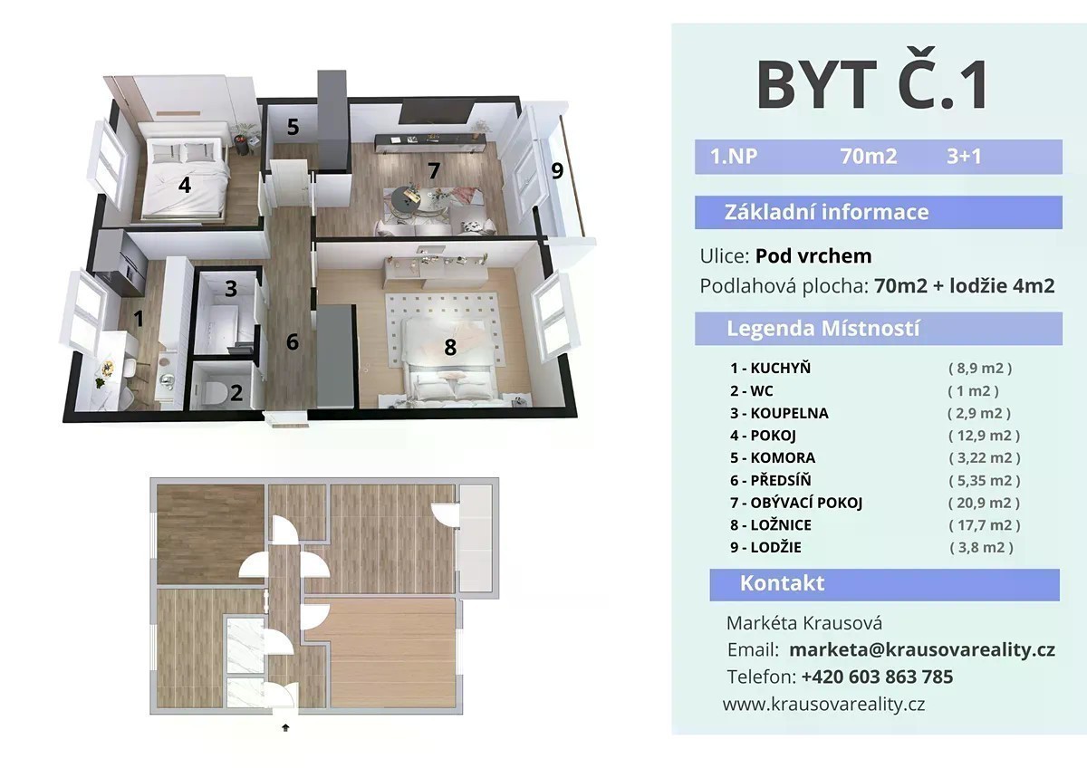 Popis nemovitosti Představuji Vám k prodeji byt o dispozici 3+1 po částečné rekonstrukci v revitalizovaném cihlovém domě v klidné lokalitě plzeňské čtvrti Lobzy. Byt informace: - dispozice 3+1, 70 m2 - 1. patro - orientace bytu - východ (2 pokoj), západ - 2 pokoje - okna plastová - ihned k dispozici - topení - dálkově - plyn zaveden (sporák) - teplou vodu zajišťuje lokální zdroj - plynová karma - elektřina původní, nové rozvody pouze v kuchyni - příprava na kuchyňkou linku - sklep 4 m2 - lodžie 4 m2 Byt disponuje předsíní, komorou, 3 pokoji, kuchyní, samostatným wc a koupelnou. K bytu náleží lodžie a sklepní jednotka. Byt se nabízí bez vybavení, kuchyňská linka není součástí. V kuchyni je pouze příprava na umístění nového vybavení. Byt se nachází v prvním patře, jedná se ovšem o druhé nadzemní podlaží. V prvním podlaží jsou garáže a společné prostory jako je sušárna, kolárna, sklepy, apod. Dům informace: - cihlový dům po kompletní revitalizaci Dům je po dokončené revitalizaci - nová fasáda, lodžie, zateplení - provedené v loňském roce, vstupní dveře, zvonky. Lokalita: Dům se nachází v klidné lokalitě plzeňské čtvrti Lobzy. V okolí je dostatek místa na parkování. Za domem krásný park se vzrostlými stromy a atrakcemi pro děti. V těsné blízkosti jsou obchody s potravinami, nákupní středisko ´Centrum´, či vzdálenější Obchodní centrum Rokycanská, mateřská škola, základní škola, restaurace, lékárna, pošta, zastávky MHD a mnoho dalšího. Pro koupi bytu Vám zajistím kompletní realitní a právní servis a v případě potřeby i výhodné financování hypotečním úvěrem.