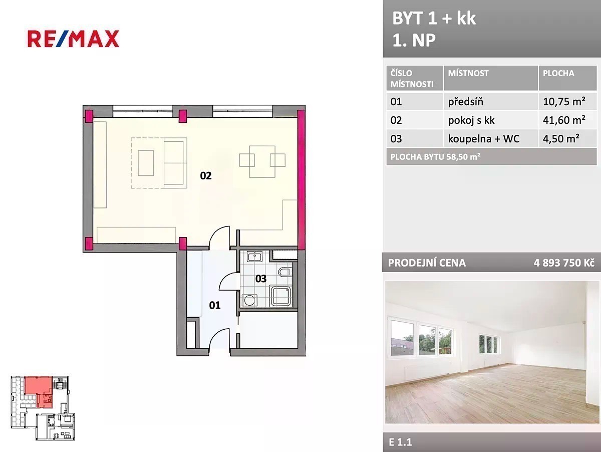 V exkluzivním zastoupení nabízíme prodej nové bytové jednotky 1+kk v developerském projektu Rezidence Barcelona na ulici Bezručova v centru města Frýdku - Místku. Tato prostorná a vzdušná bytová jednotka o ploše 58,5 m² se nachází v 1. nadzemním podlaží v sekci E, která je postavena jako první etapa projektu. Byt disponuje moderní koupelnou se sprchovým koutem a toaletou, která je součástí jednoho celku - praktické a elegantní řešení v moderním stylu. Upozorňujeme, že byt zatím není zkolaudovaný. Aktuálně se skládá 80 % z kupní ceny, přičemž doplatek 20 % proběhne po kolaudaci, která je plánována do konce letošního roku. K dispozici jsou k pronájmu parkovací stání a sklep, které bude po ukončení výstavby možné také odkoupit do osobního vlastnictví. Rezidence je umístěna ve výjimečné lokalitě na okraji sadů Bedřicha Smetany lemující řeku Ostravici. V blízkosti jsou důležité body města, jako je náměstí Svobody, OC Frýda, autobusové a vlakové nádraží, městský úřad, poliklinika, školy, školky a další městská infrastruktura. Projekt Rezidence Barcelona se skládá z osmi pětipodlažních bytových sekcí, jež nabízejí celkem 117 bytových jednotek. Náš hypoteční specialista Vám bezplatně zajistí nejvýhodnější financování u banky spolupracující na tomto projektu. Pro více informací mne neváhejte kontaktovat.