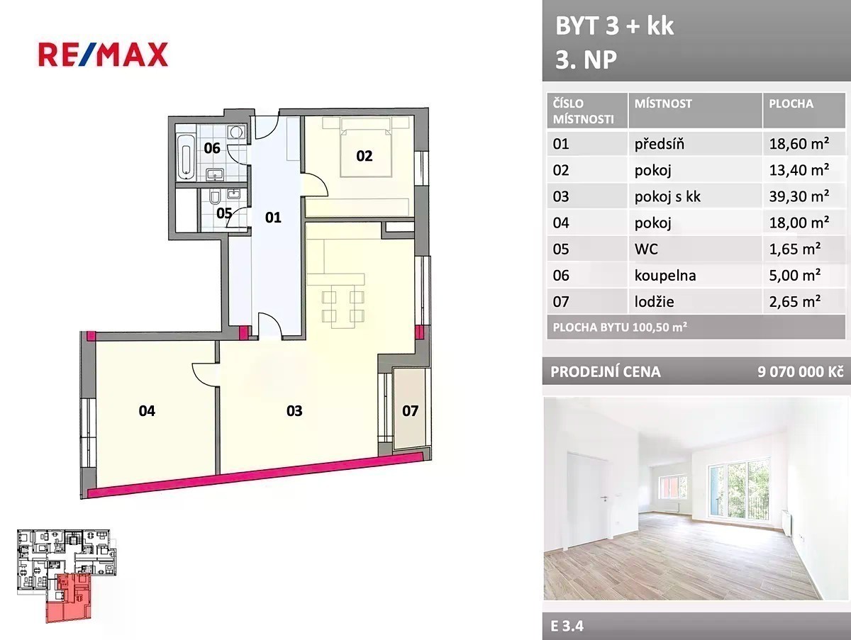 V exkluzivním zastoupení nabízíme prodej nové bytové jednotky 3+kk v developerském projektu Rezidence Barcelona na ulici Bezručova v centru města Frýdku - Místku. Tato prostorná a vzdušná bytová jednotka o ploše 100,5 m² se nachází v 3. nadzemním podlaží v sekci E, která je postavena jako první etapa projektu. K bytu náleží lodžie, která poskytuje příjemný venkovní prostor pro relexaci. Byt disponuje moderní koupelnou s vanou, přičemž toaleta je řešena samostatně, což zvyšuje komfort každodenního užívání. Upozorňujeme, že byt zatím není zkolaudovaný. Aktuálně se skládá 80 % z kupní ceny, přičemž doplatek 20 % proběhne po kolaudaci, která je plánována do konce letošního roku. K dispozici jsou k pronájmu parkovací stání a sklep, které bude po ukončení výstavby možné také odkoupit do osobního vlastnictví. Rezidence je umístěna ve výjimečné lokalitě na okraji sadů Bedřicha Smetany lemující řeku Ostravici. V blízkosti jsou důležité body města, jako je náměstí Svobody, OC Frýda, autobusové a vlakové nádraží, městský úřad, poliklinika, školy, školky a další městská infrastruktura. Projekt Rezidence Barcelona se skládá z osmi pětipodlažních bytových sekcí, jež nabízejí celkem 117 bytových jednotek. Náš hypoteční specialista Vám bezplatně zajistí nejvýhodnější financování u banky spolupracující na tomto projektu. Pro více informací mne neváhejte kontaktovat.