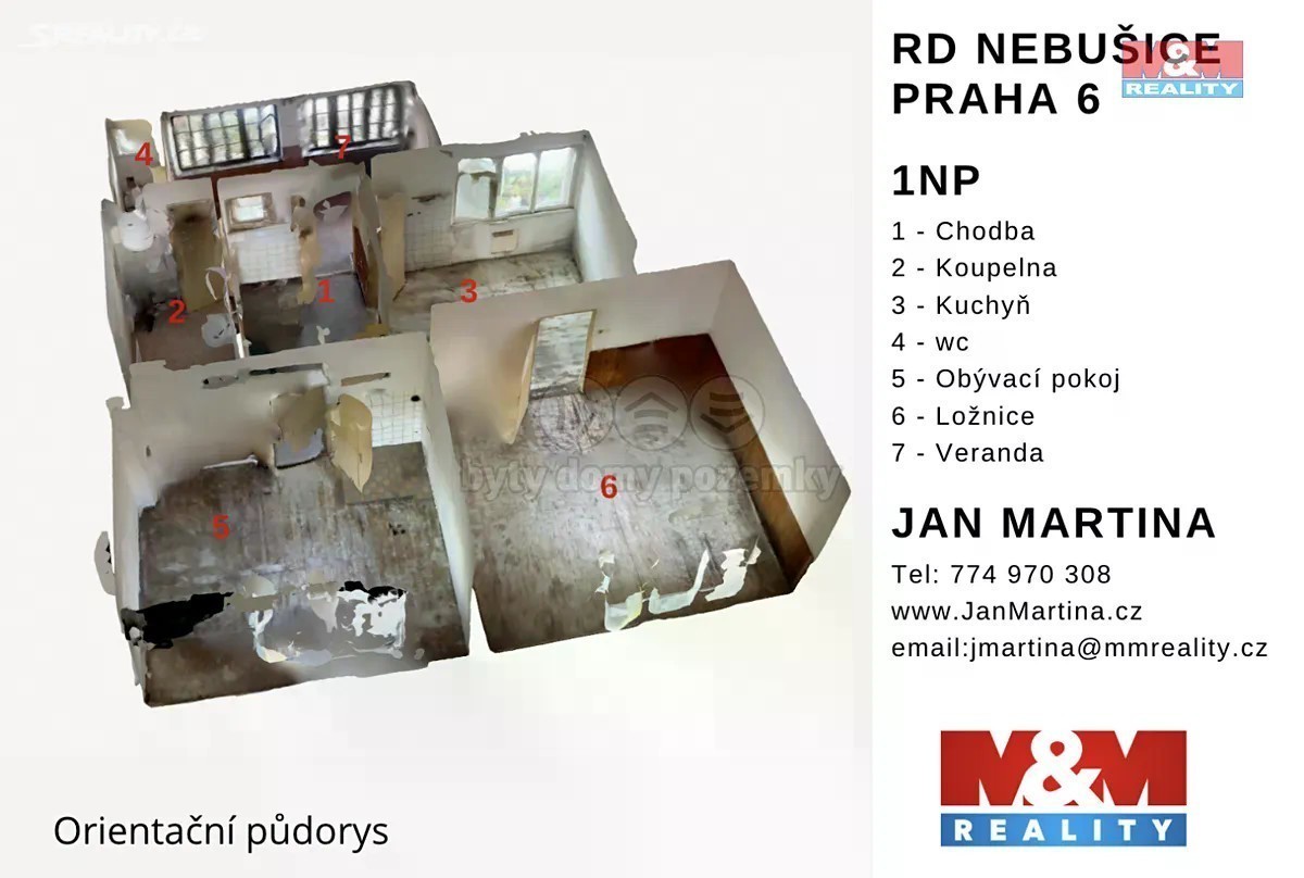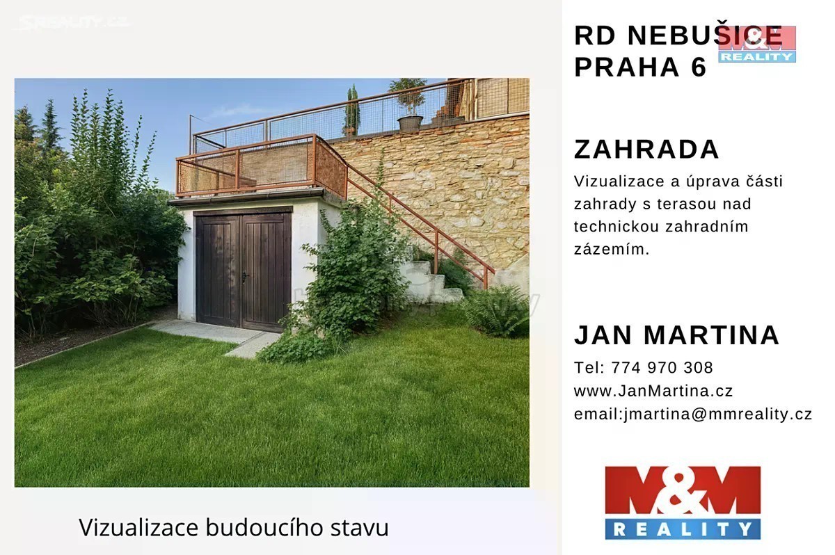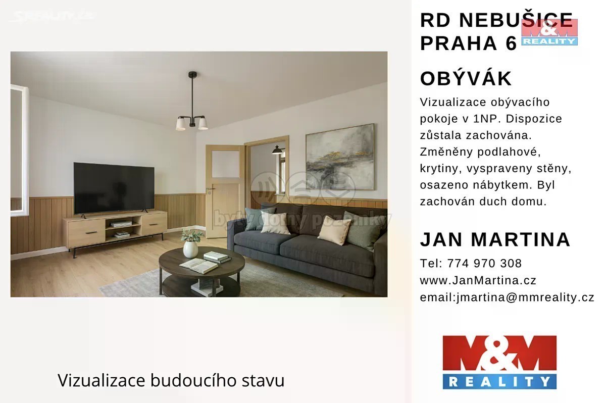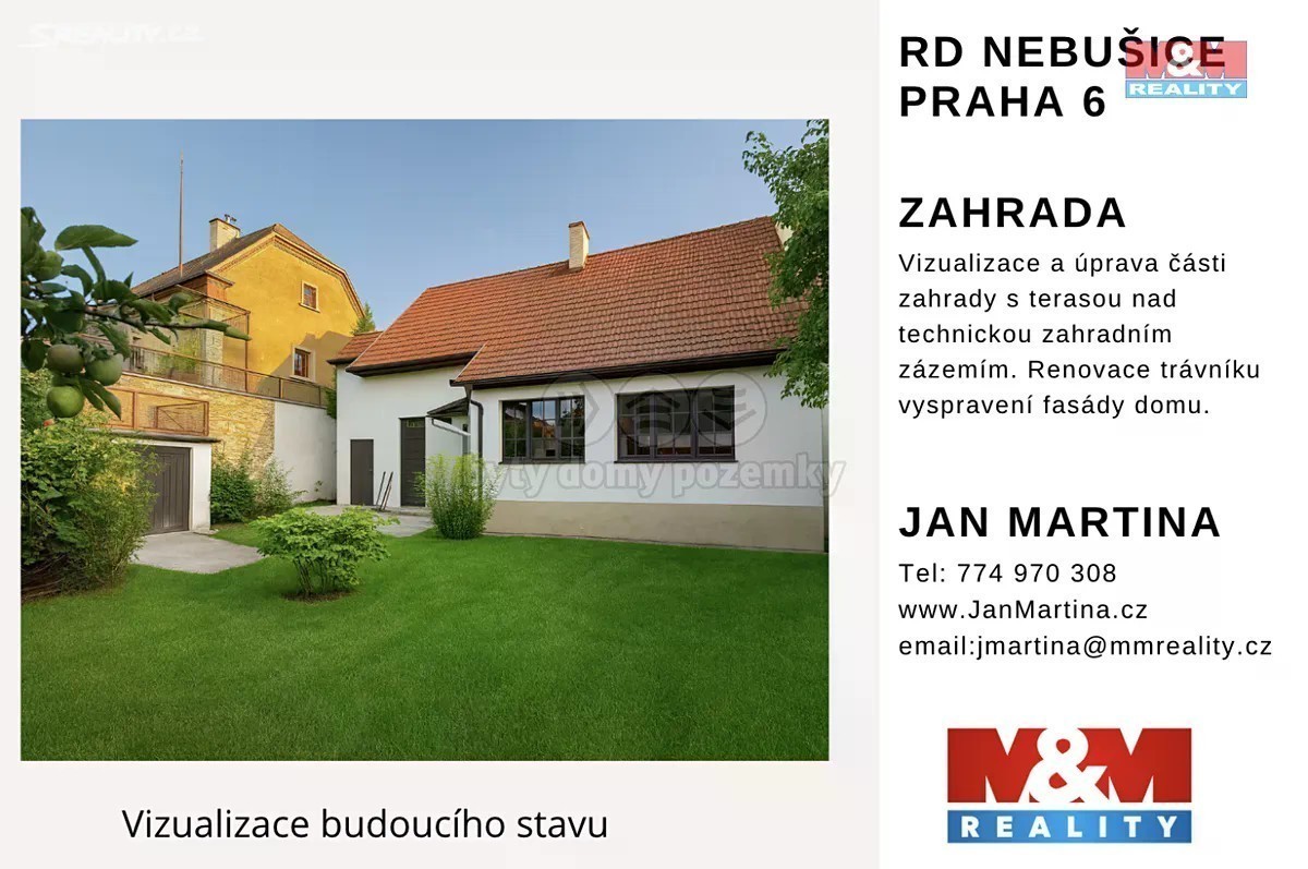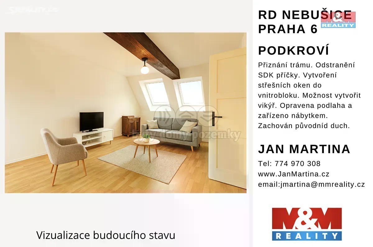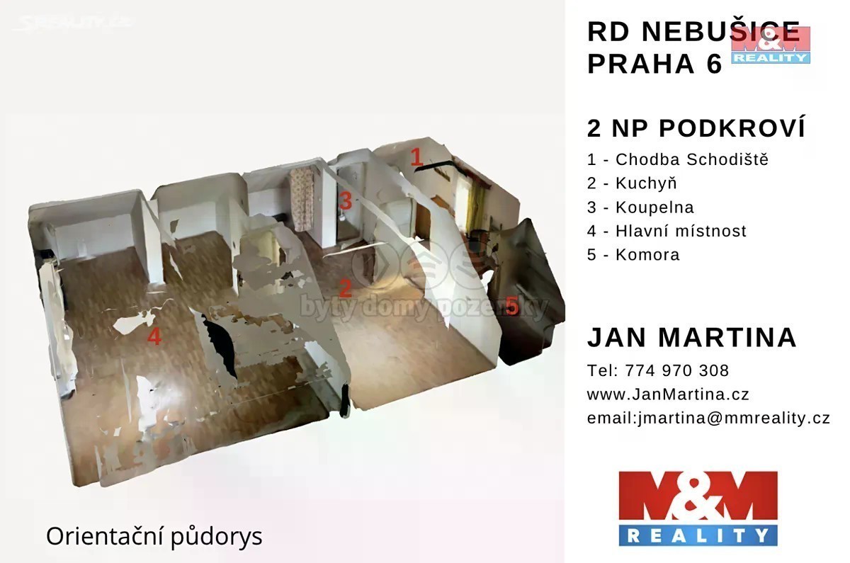 Nabízíme prodej podsklepeného dvoupodlažního rodinného domu v žádané lokalitě Praha 6 - Nebušice. Nebušice jsou lokalita se stále rostoucím potenciálem Prahy 6 a přitom již využívající výhody "Vesnice". Kompletní občanská vybavenost, včetně mezinárodní školy a dopravní dostupnost je v místě. Nemovitost dle současného rozdělení skýtá dvě bytové jednotky o dispozicích 3+KK a 1+1 a jsou v původní, částečně udržovaném stavu a dávají novému majiteli možnost úprav podle vlastních představ. Po rozšíření střechy lze vybudovat dva prostorné byty - jeden s předzahrádkou, druhý s terasou. Útulná zahrada je ideální pro odpočinek, zahradničení nebo menší doplňkový projekt výstavby. Tato nemovitost je skvělou příležitostí pro investory i pro ty, kdo hledají klidné a rodinné bydlení. Veškeré informace Vám poskytne makléř, který je pro Vás k dispozici.