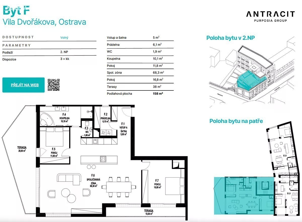 Unikátní byt ve Vile Dvořákova právě v nabídce Byt v historickém centru města, umístěný v nejvyšším patře noblesní historické vily z roku 1895. Dispozice: 3 + kk / Podlaží: 2.NP / Podlahová plocha: 120 m² + 38 m² teras - Výhled do klidné zahrady, parku i na město - Soukromá zahrada jako součást domu - Dvě prostorné terasy - Parkovací místo, sklep - Bezbariérový přístup - Nadčasový interiér s důrazem na detail, kvalitu a trvanlivost - Prémiové materiály a moderní technologie - Tepelný příkon bytu F = 12,84 kW/ m³; referenční hodnoty: pasivní dům = 10 kW/ m³, nízkoenergetický dům = 20-30 kW/ m³