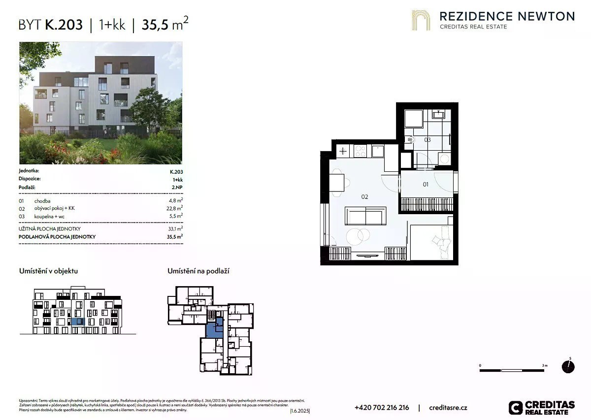 Dovolujeme si vám nabídnout byt 1+kk o celkové výměře 36 m², umístěný v 2. NP, který je součástí projektu Rezidence Newton v pražských Kobylisích. Rezidence Newton přináší moderní bydlení v komorním projektu s pouhými 35 byty, zasazeném do klidného vnitrobloku se vzrostlou zelení, jen pár kroků od Kobyliského náměstí a stanice metra C. Projekt spojuje soukromí s výhodami městského života - perfektní dostupnost, kompletní občanská vybavenost i rychlé spojení do centra Prahy. Byty jsou navrženy s důrazem na komfort a funkčnost. Vybrané jednotky disponují velkorysými předzahrádkami, lodžiemi či terasami s panoramatickými výhledy na Prahu, zatímco jiné ocení praktičnost dispozic nebo klidnou orientaci do vnitrobloku. V prvním podzemním podlaží se nachází parkovací stání a sklepy. Cena garážového stání začíná na 600 000 Kč vč. DPH, cena sklepu pak od 129 000 Kč vč. DPH. Plánované dokončení projektu: 1.Q 2028. V případě zájmu nás neváhejte kontaktovat. Prodej probíhá přímo od majitele. Více informací o tomto bytu a kompletní nabídce najdete na webu CREDITAS Real Estate.