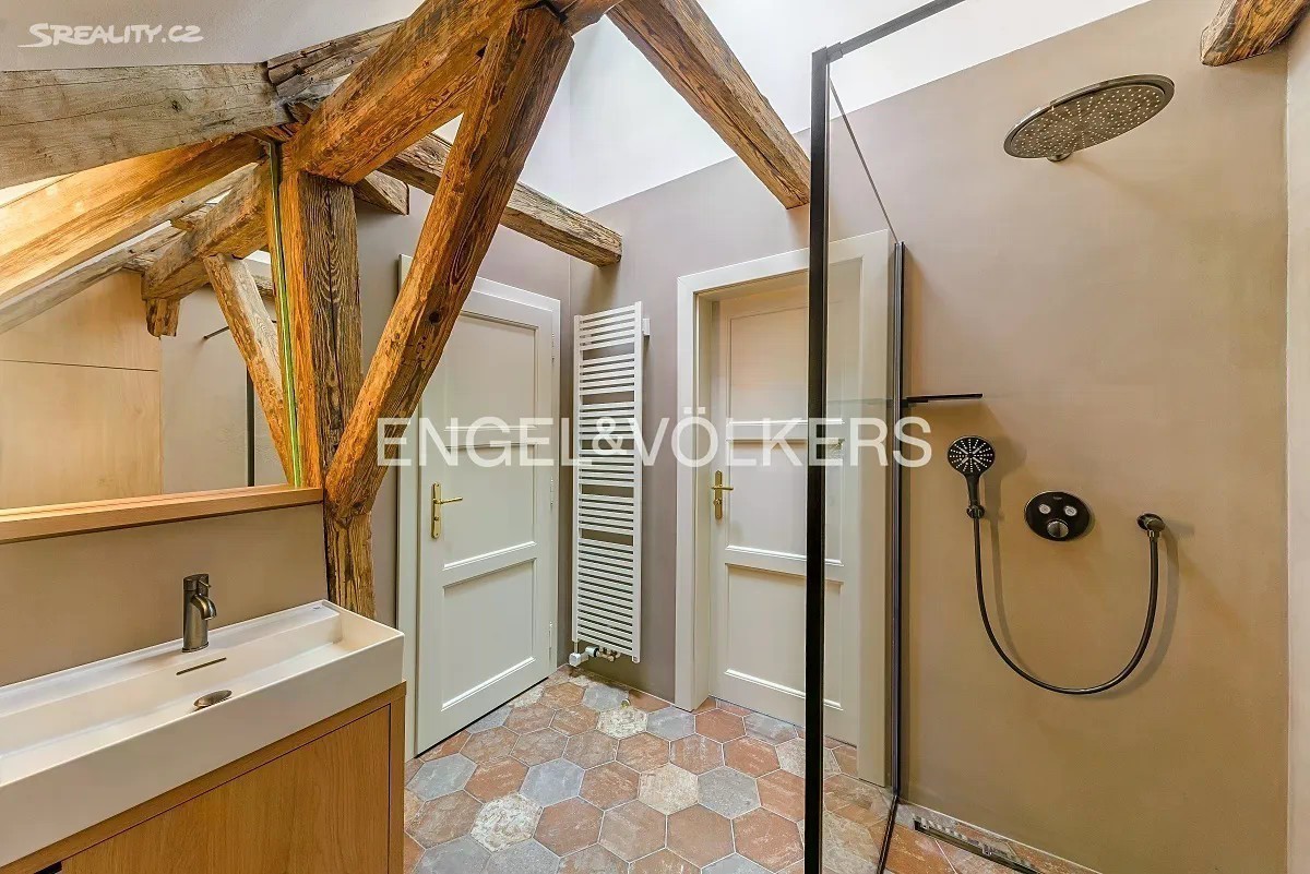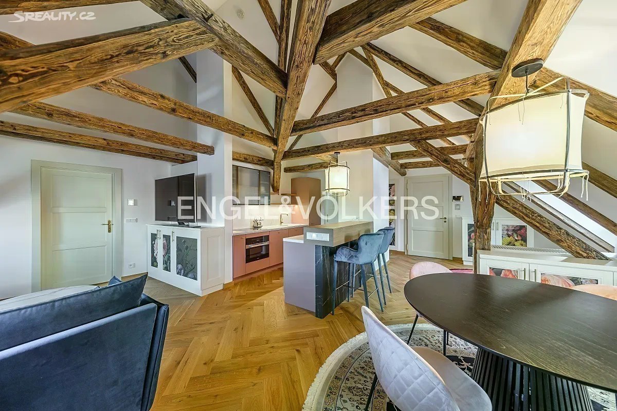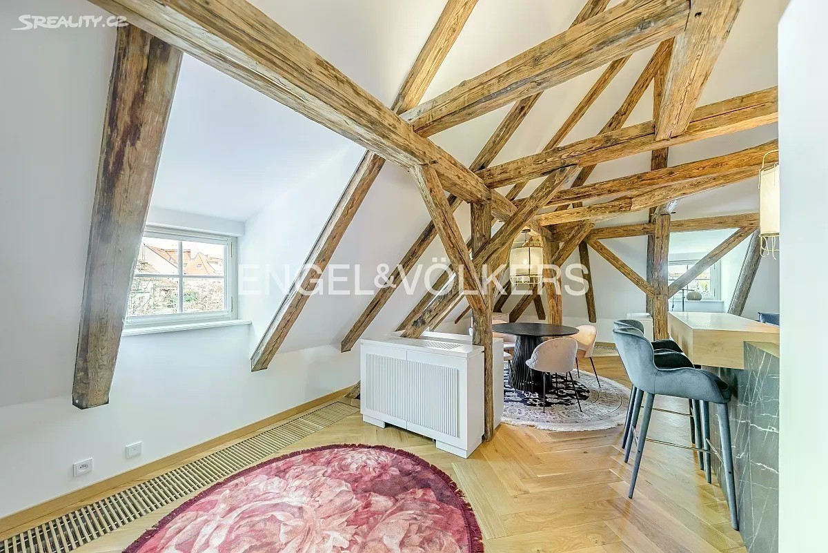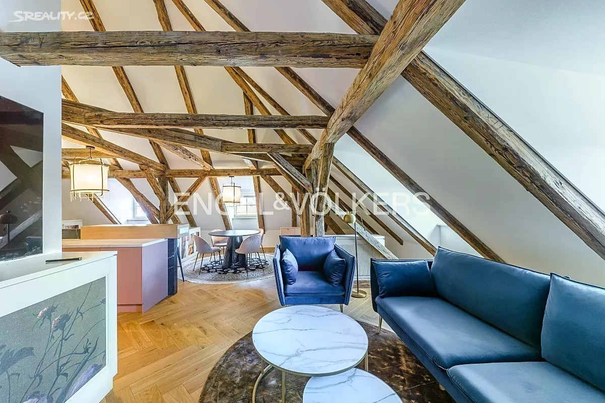 Pinkasův palác ze 16. století prošel kompletní rekonstrukcí, při které se dbalo na zachování původních prvků a zároveň vytvoření moderní rezidence s výtahem, recepcí, wellness s finskou saunou a parní saunou, posilovnou a možností parkingu. Luxusní plně zařízený a klimatizovaný mezonetový apartmán se nachází v posledním čtvrtém nadzemním podlaží této exkluzivní rezidence. Unikátní dispozice se samostatnou ložnicí s vestavěnými skříněmi a en-suite koupelnou, velkorysým obývacím pokojem s plně vybavenou kuchyní na míru se spotřebiči Miele a krásnými výhledy na Karlův most a Vltavu. V apartmánu jsou dřevěné podlahy, klimatizace, vestavěné skříně a elektricky ovládané rolety. Pračka a sušička je součástí pronájmu a je zabudovaná ve vestavěné skříni. Pro nájemníky je možnost zvolit úroveň služeb od standardních, až po exkluzivní včetně hotelových služeb. Byt je možné pronajmout i střednědobě na 6 měsíců. Poplatky se odvíjí od zvoleného balíčku služeb - Standard, Exclusive, Premium, či Deluxe - cena začíná na 5 400 Kč / měsíc.