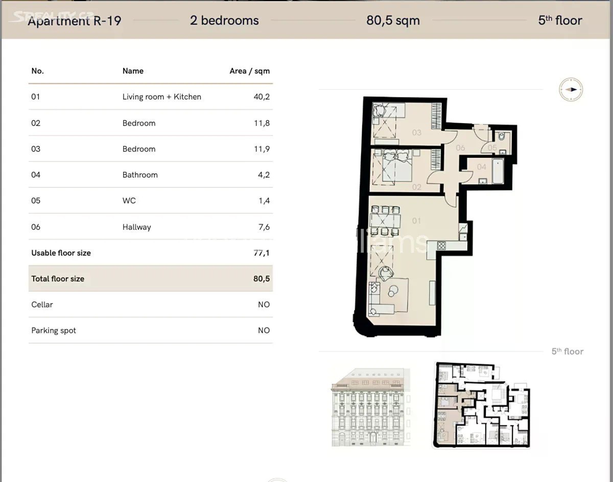 V 5. podlaží Rezidence Svornosti situované v centrální části Smíchova, na dosah ruky stanice metra Anděl i zastávky tramvají a široké nabídky restaurací, kaváren i obchodů, se nachází klimatizovaný třípokojový byt s balkónem orientovaným do tichého vnitrobloku. Jednotka je dispozičně členěna na obývací pokoj s kuchyňským koutem a vstupem na západní balkón, 2 ložnice, koupelnu s vanou, samostatnou toaletu, šatnu a vstupní halu. Okna i podlahy jsou dřevěné, vybavení zahrnuje kuchyňskou linku na míru zařízenou vestavěnými spotřebiči. Vytápění zajišťuje centrální kotelna, pro větší pohodlí je instalována klimatizace. Společné prostory činžovního domu zdobí zrepasované původní architektonické a řemeslné prvky. Jednotlivá patra spojuje nejen výjimečné historické schodiště, ale i moderní výtah. Díky blízkosti centra města, stanice metra a kompletní občanské vybavenosti patří Smíchov k nejvyhledávanějším pražským lokalitám. Čtvrť kombinuje historický šarm secesních domů a divadel s moderními nákupními centry a kancelářemi, pestrou nabídkou bister, kaváren a barů. V okolí pětihvězdičkového centra Nový Smíchov se nachází 2 multikina i široký výběr restaurací včetně unikátního gastronomického a společenského prostoru Manifesto Market. Podlahová plocha 77,6 m2, balkón 3,9 m2.