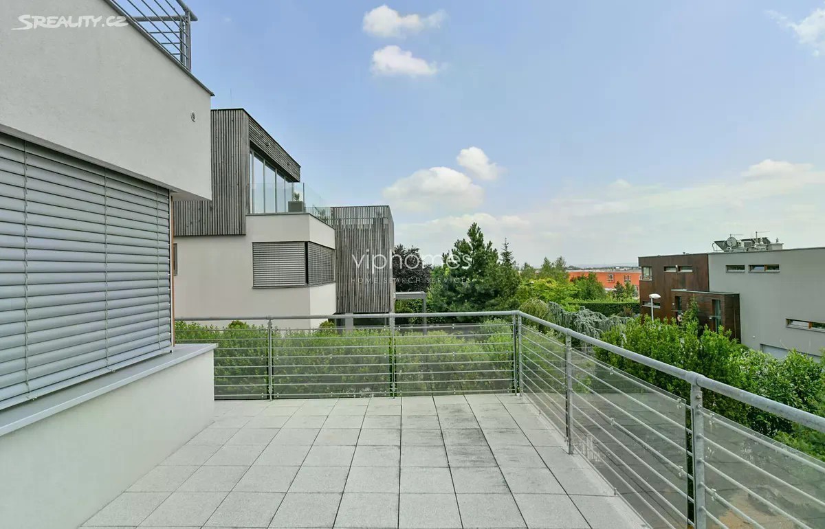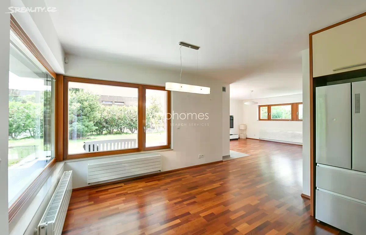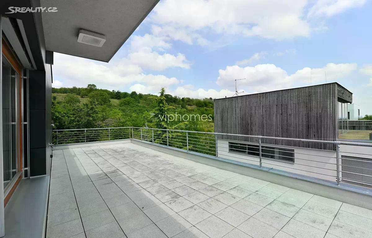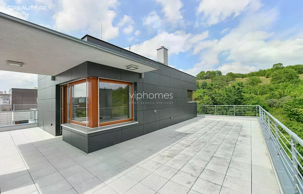 Příjemné bydlení, kousek od Německé školy, nedaleko Prokopského údolí; výborná dostupnost na letiště a do centra, v pěším dosahu stanice metra Nové Butovice. Moderní vila s 3 terasami, a nádherným panoramatickým výhledem na okolní zástavbu ze spoustou zeleně je součástí rezidenčního komplexu "Botanica" v Praze 5, Jinonicích, moderní rezidenční čtvrti, harmonicky propojené s lesoparkem Vidoule. Plně klimatizovaná vila vyniká kvalitním provedením a nabízí: 5 ložnic, 4 koupelny, 3 terasy. Přízemí: prostorný obývací pokoj s krbem a velkými francouzskými okny, jimiž se vstupuje na terasu a zahradu (567 m2), dále moderní, plně vybavena kuchyň, šatna, koupelna ze sprchovým koutem, a samostatná toaleta. Integrovaná garáž. V prvním patře je situována hlavní ložnice s vlastní koupelnou, šatnou a velkou terasou, další tři ložnice, společná plně vybavena koupelna. Další patro nabízí velkou ložnici s koupelnou a jihovýchodně orientovanou střešní terasou (79 m2). V suterénu (140 m2) naleznete 3 místnosti, (fitness, herna apod.), dále technickou místnost, prádelnu, dvě komory. Klimatizace, podlahové vytápění v koupelnách a na WC, alarm, TV a PC připojení v každém pokoji, elektrické žaluzie, centrální vysavač, satelitní připojení, alarm. Dekorativní zahrada s automatickým závlahovým systémem. Garáž pro dvě auta. Stanice metra trasy B je pohodlně dosažitelná pěšky, autem jste za několik minut u přípojky dálnice D5, odkud je to jen 15 minut jízdy na letiště. V blízkosti najdete supermarkety Albert, Tesco, nákupní centrum Galerie Butovice a Zličín. Kauce: 2 měsíční nájmy. Nájemné: 125.000 Kč + poplatky 17.600 Kč/měsíc. K dispozici: od ledna 2026. Prohlídky jsou možné od listopadu 2025.