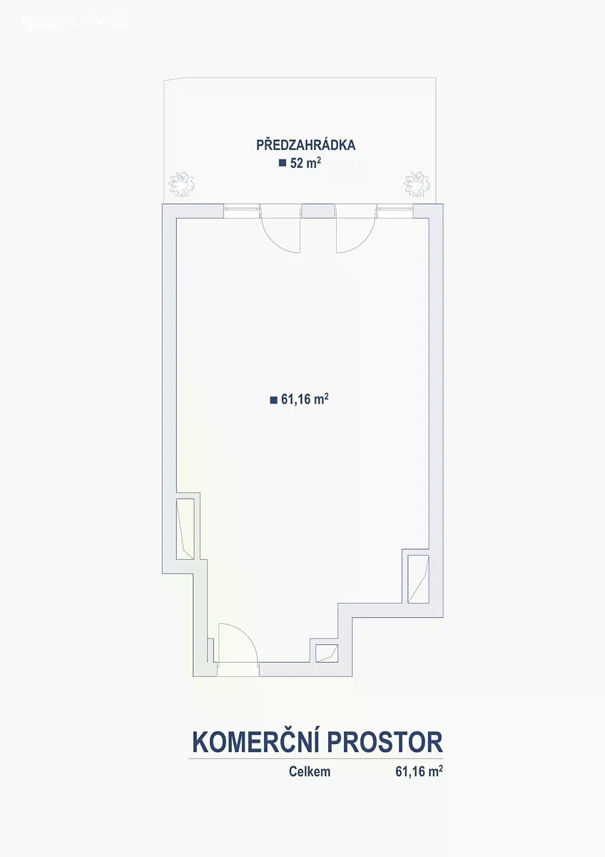 Nabízíme k pronájmu nový komerční prostor s předzahrádkou, který se nachází v přízemí moderního rezidenčního komplexu tří bytových domů na adrese Komárovská 744/15 v Brně-Komárově. Atraktivní lokalita a prostředí: • umístění přímo v novostavbě rezidenčního projektu se třemi bytovými domy • desítky nových bytů = stabilní základna budoucích zákazníků • skvělá dopravní dostupnost - pár minut do centra Brna • zastávky MHD (tramvaj, autobus) v pěší vzdálenosti • rostoucí městská čtvrť s vysokým potenciálem pro obchod i služby Možnosti využití prostoru: • kavárna, bistro či restaurace - díky předzahrádce ideální pro gastro provoz • obchod - potraviny, pekárna, specializovaná prodejna nebo showroom • služby - kosmetika, kadeřnictví, barber shop, masáže či jiné wellness služby • kanceláře nebo klientské centrum - reprezentativní místo s výhodou přímého vstupu z ulice Parametry a flexibilita: • plocha interiéru 61,1 m² + předzahrádka 52 m² • extra vysoký strop umožňuje vybudování mezonetového patra • přízemí s přímým vstupem z ulice • prostor ve stavu shell & core (bez finálních povrchových úprav) • možnost dohody s majitelem na dokončení interiéru • sleva z nájemného při kompletním zhotovení interiéru nájemcem • možnost uzavření dlouhodobé nájemní smlouvy Jsme připraveni s Vámi konzultovat Váš návrh a společně najít optimální řešení pro jeho realizaci.