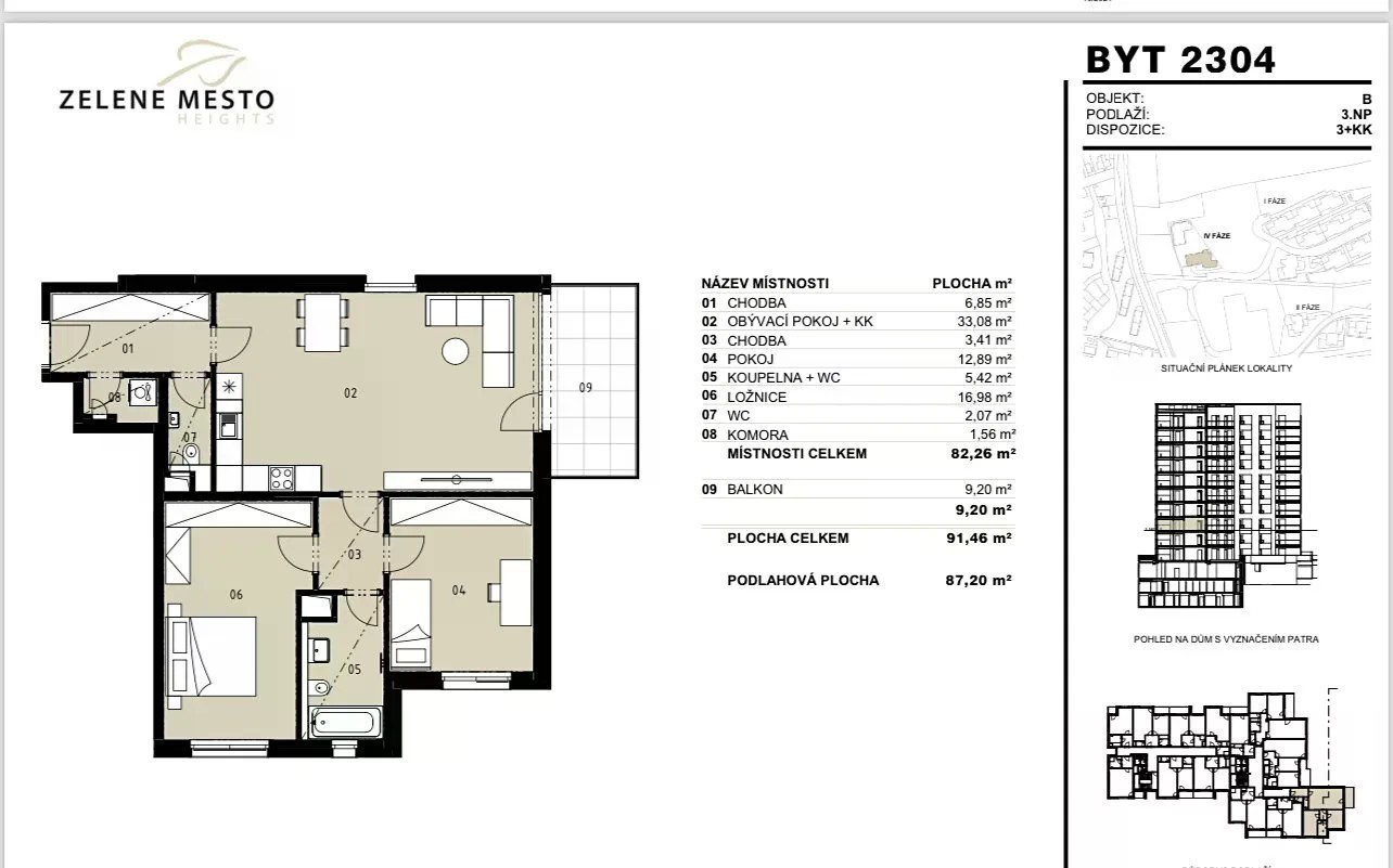 Nabízíme k prodeji prostorný a světlý byt 3+kk o výměře 82 m² s balkonem, umístěný ve 3. patře moderní novostavby v prestižním rezidenčním projektu Zelené Město Heights. Byt je navržen s důrazem na funkčnost a komfort. Dispozici tvoří prostorný obývací pokoj s kuchyňským koutem a přímým vstupem na balkon, dvě ložnice, koupelna, samostatná toaleta a praktická komora/šatna. Díky velkým oknům je byt mimořádně prosvětlený a nabízí příjemné výhledy do okolní zeleně. Součástí projektu je privátní park se vzrostlou zelení, dětskými hřišti a dostatkem klidových zón. Lokalita nabízí ideální spojení klidného bydlení u přírody a zároveň skvělé dopravní dostupnosti do centra města - v blízkosti je MHD i občanská vybavenost (obchody, školy, školky, sportoviště). Další výhody: • novostavba s vysokým standardem provedení • balkon pro relaxaci • garážového stání a sklepa • bezbariérový přístup, výtah Cena: bytu : 13 070 000 Kč Cena parkovacího stání : 600 000,-Kč Cena sklepu: 190 000, -Kč K bytu nutno dokoupit sklep a parkovací szání. Asking price 13 070 000 Kč Storage unit 190 000 CZK Parking : 600 000 CZK The flat must be purchased parking space and cellar.