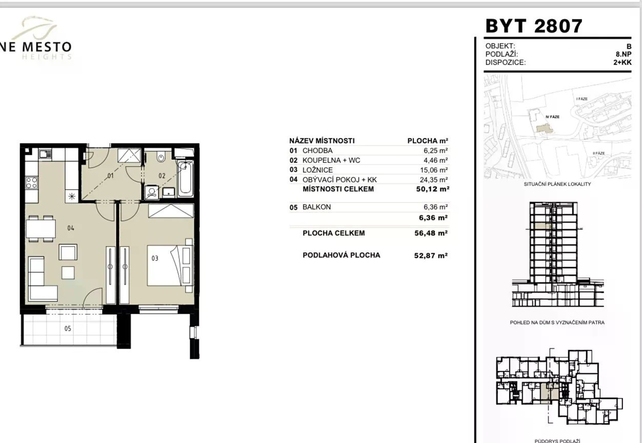 Moderní byt 2+kk 52,87 m2 k prodeji světlý a prakticky řešený byt 2+kk o celkové ploše 56 m² v atraktivním rezidenčním projektu Zelené Město Heights. Byt se nachází v 8. nadzemním podlaží domu B a disponuje balkonem s příjemným výhledem. Dispozice bytu: • chodba: 6,25 m² • koupelna s WC: 4,46 m² • ložnice: 15,06 m² • obývací pokoj s kuchyňským koutem: 24,35 m² • balkon: 6,36 m² Celková plocha: 56,48 m² (podlahová plocha 52,87 m² + balkon 6,36 m²) Cena bytu 8 629 542 Kč Cena sklepu : 168 168 Kč Cena parkovacího stání 442 290 Kč K bytu se musí přikoupit parkovací stání a sklep. Byt nabízí moderní standard, velká okna zajišťující dostatek denního světla a vstup na prostorný balkon. Dispozice je ideální pro jednotlivce, pár nebo jako investice na pronájem. Rezidenční projekt Zelené Město Heights je situován v klidné lokalitě obklopené zelení, zároveň s výbornou dostupností do centra města. Obyvatelé mají k dispozici privátní park, dětská hřiště a relaxační zóny. V okolí se nachází kompletní občanská vybavenost - obchody, školy, školky i sportoviště. Další výhody: • novostavba s vysokým standardem provedení • balkon pro relaxaci • bezbariérový přístup, výtah • součástí prodeje je povinný dokoupení sklepní kóje a garážového parkovacího stání apartment (2+kk layout) with a total area of 56.48 m², located on the 8th floor of Building B in the prestigious residential project Zelené Město Heights. The apartment includes a spacious balcony with pleasant views. Apartment layout: • Entrance hall: 6.25 m² • Bathroom with toilet: 4.46 m² • Bedroom: 15.06 m² • Living room with kitchenette: 24.35 m² • Balcony: 6.36 m² Total area: 56.48 m² (floor area 52.87 m² + balcony 6.36 m²) The apartment offers a modern standard, large windows providing plenty of natural light, and direct access to a spacious balcony. Its layout is ideal for singles, couples, or as an investment property for rental purposes. The Zelené Město Heights residential project is located in a quiet area surrounded by greenery while maintaining excellent accessibility to the city center. Residents benefit from a private landscaped park, children's playgrounds, and relaxation zones. The neighborhood also offers full amenities including shops, schools, kindergartens, and sports facilities. Additional features: • New-build with high-standard finishes • Balcony for relaxation • Barrier-free access and elevator • Purchase of a cellar unit and underground parking space is required