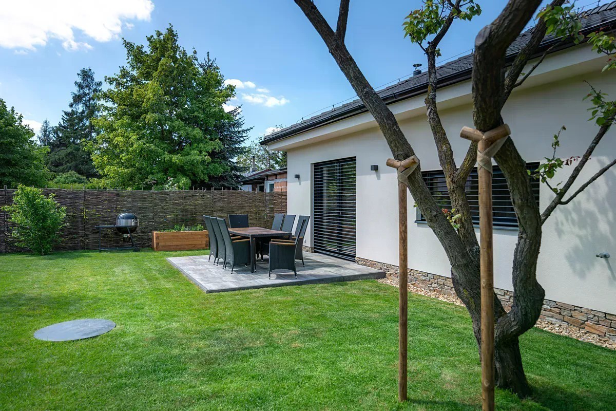 Nový, stylový a velmi úsporný cihlový bungalov doslova minutu od největšího Pražského lesa, kolaudovaný na konci roku 2024, postavený ve vysokém standardu s dispozicí 4+KK + samostatné WC, technická místnost a úložný prostor na pochozí půdě o ploše cca 40m2. TECHNICKÉ VYBAVENÍ A KOMFORT: Tepelné čerpadlo Nibe + vnitřní chytrá jednotka Lucie s aplikací v mobilu, podlahové topení Rehau Designový krb Romotop s přisáváním vzduchu z venku Vinylová podlaha Meister, sádrové omítky Dveře Sapeli Klimatizace v obývacím pokoji a ložnici ( jih a západ ) Svítidla s možností regulace jasu a teploty světla pro lepší spaní a atmosféru Venkovní žaluzie na všech oknech s aplikací v mobilu Okna trojskla V technické místnosti je pračka i sušička s aplikací v mobilu Praktická dispozice počítá s vestavěnými skříněmi viz půdorys ️KUCHYNĚ A KOUPELNA: Kuchyň na míru od studia Chvojka Veliká vestavěná lednice ( 75cm šířka, 2m výška ) Kompletní spotřebiče V koupelně a na WC kvalitní italská keramika Dvě umyvadla s nábytkem Dřevojas, baterie Hansgrohe Oboustranná veliká vana napouštěná přepadem Ve sprše 90x90cm je tropický déšť + klasická sprcha a nika EXTERIÉR A ZAHRADA: Parkování pro 2 auta + další stání pár metrů od domu Příprava pro elektronabíječku Samonosná brána na dálkové ovládání Retenční nádrž 5 m³ + příprava na automatickou závlahu Studna vybavená novým čerpadlem s automatickým spínačem Kamenný sokl domu z pravého Kvarcitu Na zahradě meruňka, rybíz, špendlík Velký stylový truhlík s bylinkama a jahodama hned u terasy Dostatek soukromí a výhledy na okolní zeleň a les Příprava na fotovoltaiku, elektrického vrátného, zahradní osvětlení a kamerový systém. LOKALITA A OKOLÍ: Dům se nachází v klidné a nenápadné uličce na okraji Prahy jen 1 minutu pěšky od největšího Pražského lesa parku a rezervace Ideální pro sport i relax po náročném dni, najdete tu hájenku i oboru, rybníky a několik vzácných rostlin i živočichů V celé lokalitě je spousta zeleně a vysokých stromů, krásných vil a zahrad k vidění DOSTUPNOST A OBČANSKÁ VYBAVENOST 2km od vlakového nádraží Praha Klánovice, spojení do centra Prahy každých 15 min na Masarykovo nádraží nebo na Hlavní nádraží, jízda jen 20min. komfortním vlakem. 7 minut pěšky od domu na BUS (5 min tímto busem na vlak) 15 minut autem metro Černý Most. Praha Klánovice nabízí občanskou vybavenost na vysoké úrovni, areál s koupalištěm, skvělé restaurace, sportoviště, turistické trasy, školky, školy, doktoři, obchody. Tento dům spojuje komfort moderního bydlení, s klidem přírody a perfektní dostupností do centra Prahy. Cena zahrnuje i veškerý vnitřní a venkovní nábytek, a full servis. K nastěhování ihned. Pro více informací či domluvení prohlídky mě neváhejte kontaktovat, budu se těšit. Vojta Budař.
