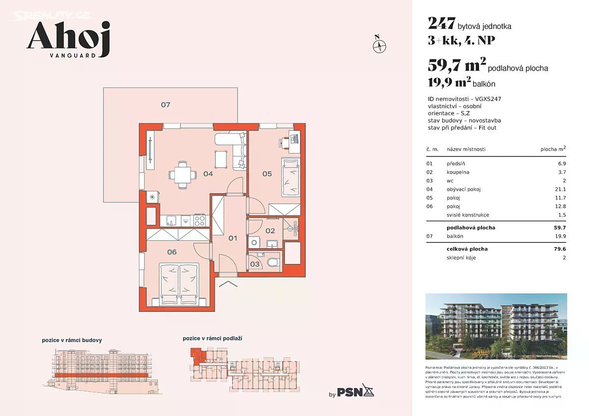 Nabízíme k prodeji moderní byt 3+kk ve 4. podlaží prestižního rezidenčního projektu Ahoj Vanguard na Praze 4. Tento prostorný byt disponuje podlahovou plochou 59,7 m² a krásným balkónem o rozloze 19,9 m², který je ideální pro relaxaci a posezení. Součástí bytu je sklepní kóje o velikosti 2 m² a garážové stání, jehož cena činí 700.000 Kč. Celková cena bytu činí 11.800.000 Kč. Jedním z hlavních benefitů tohoto bydlení je zcela výjimečné zázemí a služby, které v Praze i v celé České republice nemají obdoby. Rezidentům je k dispozici luxusní relaxační a wellness zóna umístěná v unikátním prostoru bývalého atomového krytu. Najdete zde bazén, vířivku, ochlazovnu a relaxační místnost, dále finskou a parní saunu - ideální místo pro odpočinek po náročném dni nebo k načerpání nové energie. Toto exkluzivní centrum wellness služeb je přístupné pouze obyvatelům rezidence. Dalším výjimečným benefitem je společná střešní terasa přímo v budově Ahoj Vanguard, která nabízí příjemné posezení, kuchyňku a gril - ideální pro setkávání s přáteli, oslavy i klidné večery s výhledem na okolí. Součástí areálu je také moderní dětské hřiště ve vnitrobloku. Celý projekt je navržen s důrazem na maximální pohodlí, soukromí a bezpečí rezidentů. Lokalita Modřan nabízí spojení klidného rezidenčního prostředí a výborné dostupnosti do centra města. V okolí najdete vše potřebné pro pohodlný život - obchody, restaurace, kavárny, školy i množství sportovních příležitostí a zeleně podél Vltavy. Tento byt představuje výjimečnou příležitost pro ty, kteří hledají nejen moderní a pohodlné bydlení, ale i zcela unikátní rezidenční služby v jedné z nejzajímavějších lokalit Prahy. Přiložené video s interiérem bytu je pouze ilustrativní. Konkrétní byt je vidět na fotografiích.