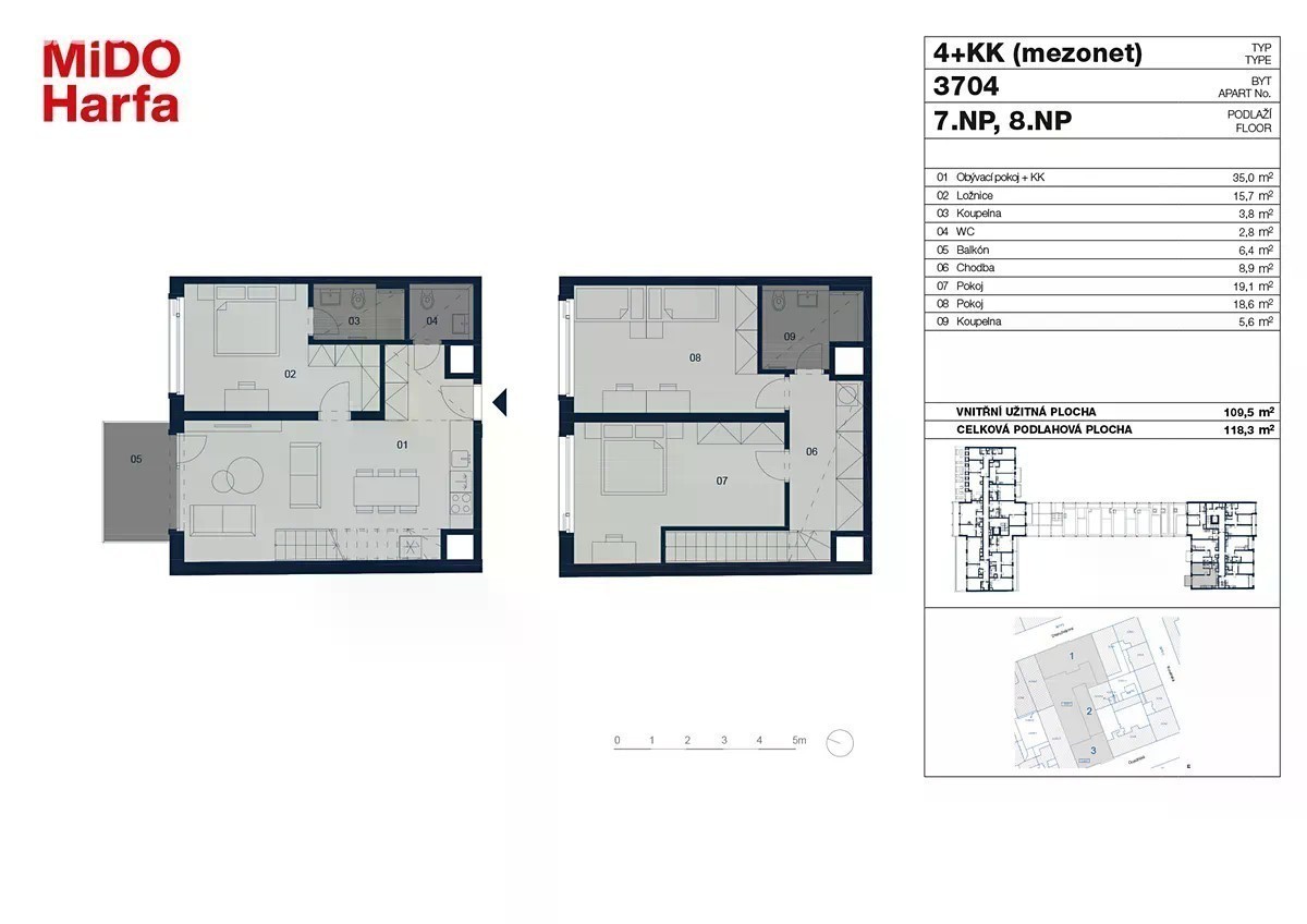 Nový projekt přímo od developerské společnosti Metrostav Development v prodeji! Dovolujeme si vám nabídnout krásný mezonetový byt o dispozici 4+kk (obch.ozn. 3704) s celkovou plochou 118,3 m2 v nově realizovaném projektu MiDO Harfa, který vyrůstá přímo u stanice metra "Českomoravská", v lokalitě Prahy 9 - Libni. Bytová jednotka je koncipována v 7. a 8. nadzemním podlaží a je orientovaná severním směrem. K bytu náleží balkon o velikosti 6,4 m2 a sklepní kóje v podzemním podlaží domu. Předností tohoto projektu je uzavřený, zelený vnitroblok - ideální místo pro odpočinek a relaxaci, poskytující svým obyvatelům klid a soukromí. Další devízou je velkorysé dispoziční řešení a vnitřní vybavení jednotek, jako jsou například velkoformátové obklady a dlažby, plastová okna s izolačním trojsklem, kvalitní vinylová podlaha, případně elektricky ovládané žaluzie či příprava na klimatizaci u vybraných bytů. Cena bytu je uvedena včetně DPH a sklepa, neobsahuje cenu garážového stání, které je možné dokoupit. Projekt je koncipován v místě s perfektní dopravní dostupností a občanskou vybaveností - v bezprostřední blízkosti najdete stanici metra „B“ Českomoravská, zastávky TRAM Ocelářská či Divadlo Gong, nákupní centrum Galerie Harfa, množství kaváren a restaurací, rozlehlý park Podviní a vše co patří k plnohodnotnému městskému životu. Rádi Vám poskytneme více informací či pomůžeme s vyřízením hypotečního úvěru přes naši partnerskou společnost.