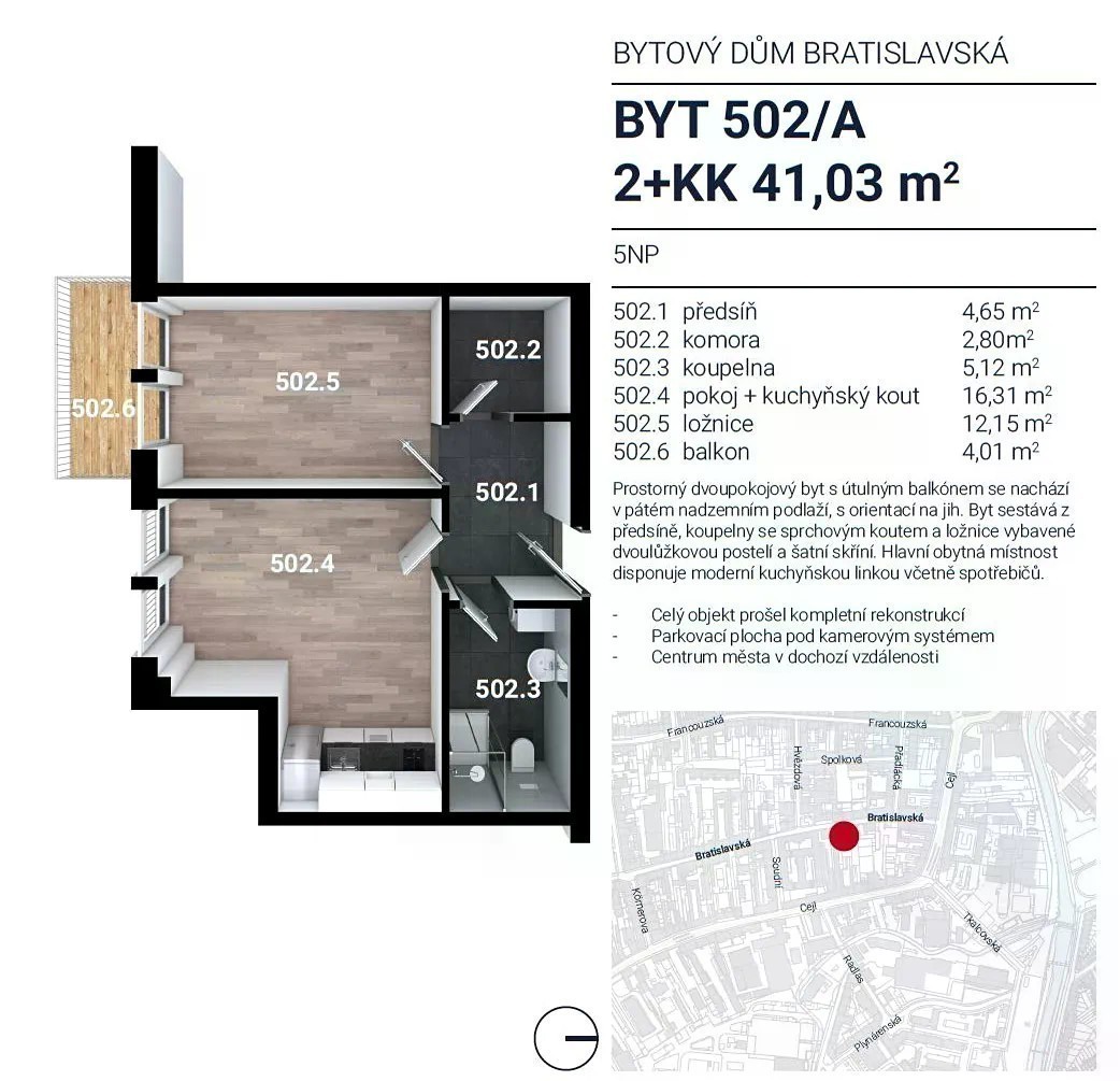 Nabízíme k pronájmu světlý byt 2+kk, který se nachází v novostavbě z roku 2017. Byt o rozloze 41 m² a balkonu 4m2 se nachází v 5.NP domu s výtahem, což zajišťuje pohodlný přístup a moderní standard bydlení. Nemovitost je částečně vybavená. V bytě je prostorná komora/šatna, která zajišťuje dostatek místa pro uskladnění věcí. Dům je umístěn v komplexu složeného ze 2 budov, které tvoří zabezpečený vnitroblok. Do vnitrobloku lze vejít z ulice Bratislavská. Majitel preferuje nekuřáky a nájemce bez domácích mazlíčků. Preferován dlouhodobý nájemce - nájemní smlouva na dobu určitou jednoho roku s možností opakovaného prodloužení. Počátek nájmu možný od 1.12.2025. Pro více informací či sjednání prohlídky mě prosím neváhejte kontaktovat. Nájemné 17.000,-Kč měsíčně, zálohy na energie a služby 4264,-Kč (bez internetu). Vratná kauce /jistota/ ve výši 35.000,-Kč a provize 20.000,-Kč vč. DPH