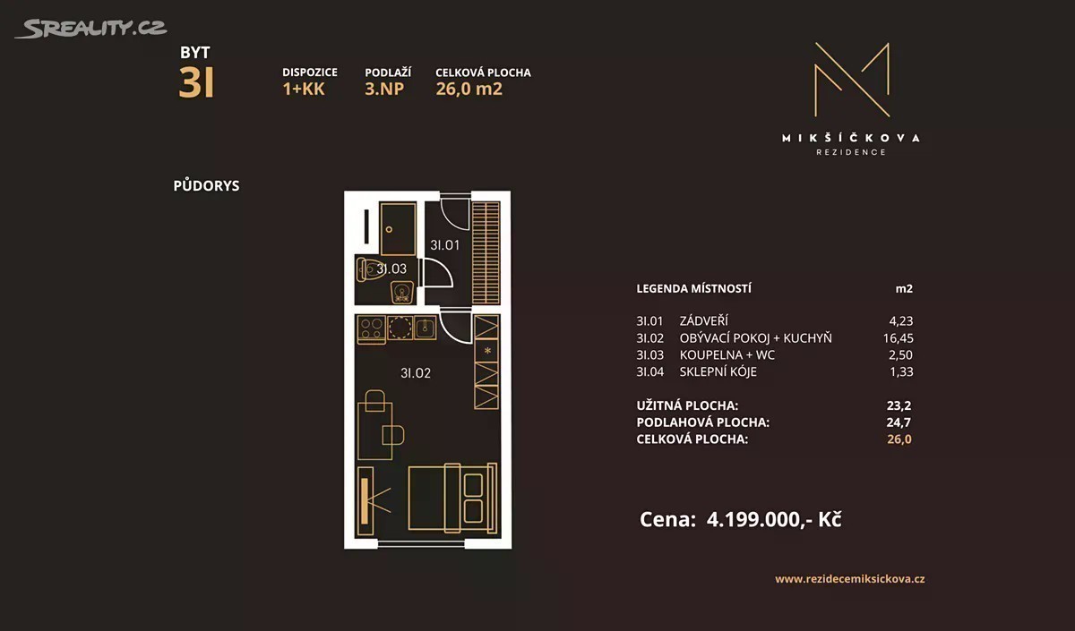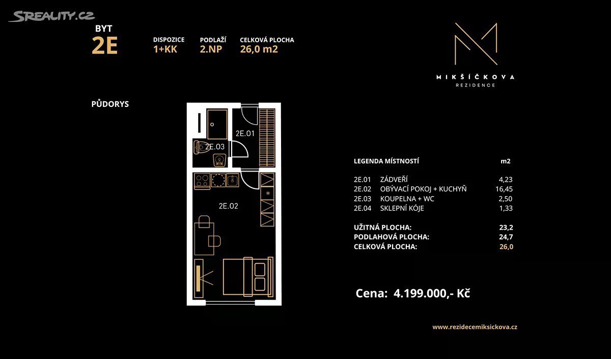 Vítejte v Rezidenci Mikšíčkova, kde nabízíme k prodeji exkluzivní byt o dispozici 1+kk, který je situovaný v jedné z nejatraktivnějších lokalit v Brně a to konkrétně v Mikšíčkově ulici v městské části Židenice. Tento moderní byt o celkové ploše 26 m² se nachází ve 2. nadzemním podlaží čtyřpodlažního bytového domu, který představuje ideální kombinaci komfortu a elegance. Tato novostavba byla pečlivě navržena s ohledem na vysoké požadavky moderního bydlení. Byt je vybavený současnými prvky, které zajišťují maximální pohodlí a funkčnost. S užitnou plochou 23,2 m² nabízí ideální prostor pro relaxaci a každodenní život, při zachování stylového a útulného prostředí. Tuto skutečnost podtrhuje dále také fakt, že v rámci bytového domu se nachází pouze 13 jednotek. Nemovitost je prodávána již včetně veškerého vybavení jako je kuchyňská linka s vestavěnými spotřebiči a také nábytek přímo na míru daným dispozicím, jehož design představuje dokonalou kombinaci ergonomie a originality. Vše je navrženo a zpracováno studiem kuchyně a nábytek ARVAY, které se vyznačuje jedinečným designem a perfektním zpracováním do posledního detailu. Hlavní předností této nemovitosti je její jedinečné umístění. Židenice se pyšní klidnou atmosférou, avšak zároveň je zde výborná dostupnost do centra města a dalších okolních lokalit. V okolí naleznete všechny potřebné služby, jako jsou obchody, restaurace a kulturní vyžití, což činí tuto lokalitu mimořádně atraktivní pro náročné klienty. Interiér bytu je důmyslně řešen tak, aby bylo maximizováno využití prostoru. Moderní design a kvalitní materiály podtrhují luxusní charakter této nemovitosti. Větraný a prosvětlený prostor je ideální pro pohodu a relaxaci, zatímco velká okna zajišťují dostatek denního světla. Celkový dojem z bytu je umocněn výbornou dopravní dostupností a širokým spektrem možností pro aktivní trávení volného času. Tento byt je nejen skvělou investicí, ale také místem, kde se spojí komfort, styl a výhody městského života. K nemovitosti je navíc možnost zakoupení garážové stání, jenž se nachází v 1. PP bytového domu. Předpokládaný termín nastěhování je: IQ/2027 Pokud Vás naše nabídka zaujala, neváhejte nás kontaktovat pro bližší informace nebo se můžeme rovnou domluvit na osobním setkání.