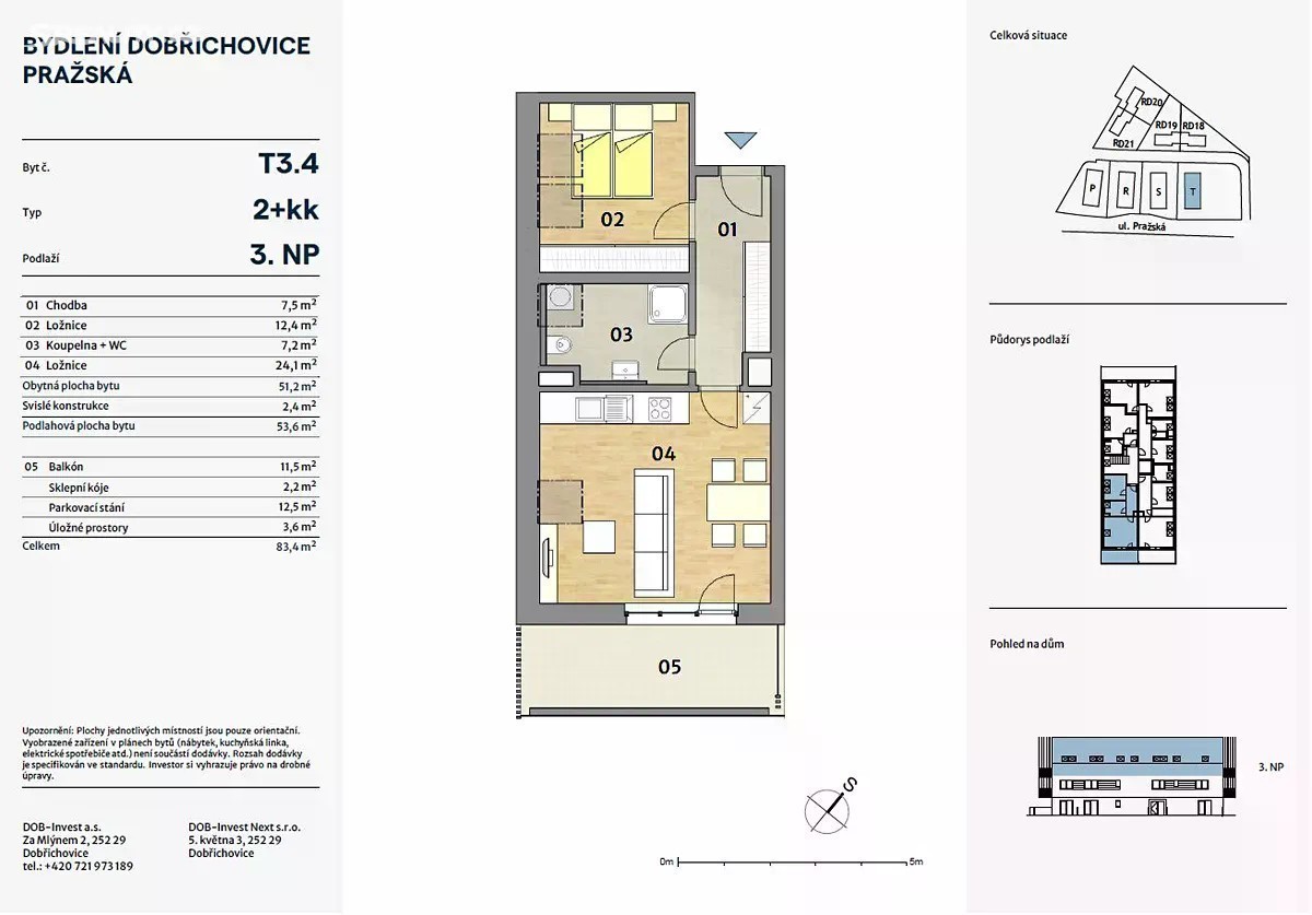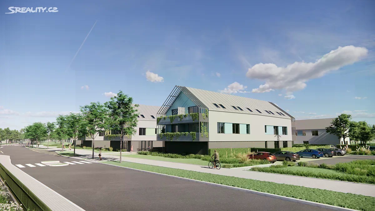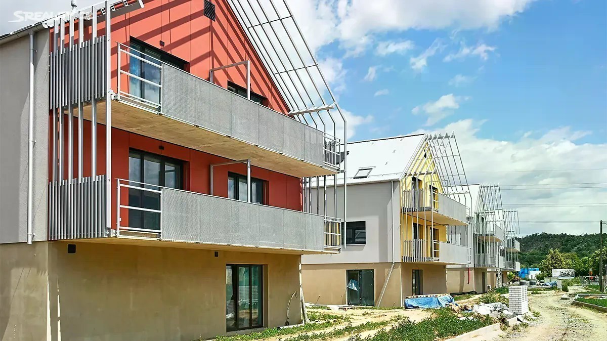 Nabízíme k prodeji byt 2+kk v novostavbě, která je součástí nového bytového komplexu na okraji města Dobřichovice. Tento byt se nachází v podkroví bytového domu „T“ a jeho součástí k výhradnímu užívání je balkon (cca 11 m²), zděný sklep umístěný ve vstupním podlaží domu o velikosti cca 2 m² a dále jedno parkovací stání umístěné na terénu před domem. V základním standardu jednotky jsou veškeré podlahy, obklady a koupelnová sanita. Byt je připojený na teplovodní centrální plynovou kotelnu umístěnou v přízemí objektu, v pokojích jsou osazena desková otopná tělesa, v koupelně topný žebřík (doplněný el. patronou pro možnost dohřevu mimo topnou sezonu), v koupelně je také elektrické podlahové vytápění (opět pro možnost přitápění nezávisle na topné sezoně). Ohřev teplé vody bude kromě plynu v letních měsících navíc zajišťován pomocí FV panelů umístěných na střeše objektu. V bytě je také instalována větrací jednotka s rekuperací tepla. Okna jsou plastová trojskla. V bytě bude provedena příprava pro osazení klimatizace (připravené elektroinstalace a rozvedené potrubí chladiva). Díky použitým moderním technologiím získala budova energetické hodnocení B - velmi úsporná. Prohlídky na stavbě zatím z bezpečnostních důvodů bohužel nenabízíme, vše důležité spolu ale můžeme probrat u nás v kanceláři. Pokud Vás byt zaujal, neváhejte nám napsat nebo zavolat, rádi se s Vámi setkáme osobně. V nabídce máme ještě 2 varianty bytů 2kk - s větší či menší výměrou - pro více info nás kontaktujte nebo navštivte oficiální stránky projektu.