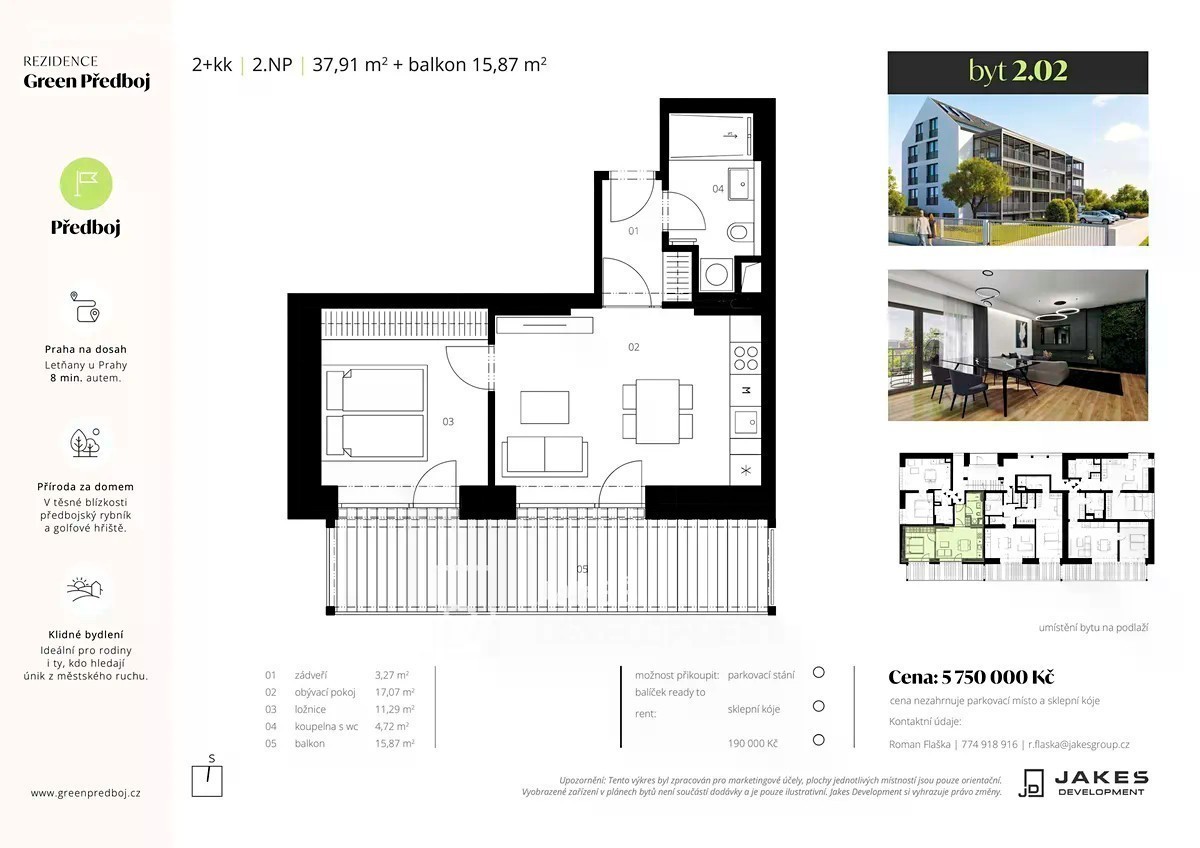 Nabízíme k prodeji byt 2+kk o velikosti 37,57 m² s balkonem o velikosti 15,87 m2 ve 2. nadzemním podlaží Rezidence Green Předboj. Byt bude dokončen ve vysokém standardu - kvalitní vinylové podlahy, moderní interiérové dveře a elegantní koupelna s keramickým obkladem a sanitou značky Laufen. Komfort zajišťuje podlahové vytápění, které přispívá k příjemné atmosféře i nízkým provozním nákladům. Moderní technologie zajistí nízké provozní náklady - vytápění i ohřev vody zajišťuje tepelné čerpadlo. Projekt bude zároveň připraven na instalaci fotovoltaiky a venkovních žaluzií, což znamená ještě větší úsporu a pohodlí. Rezidence nabízí nové byty 1+kk až 3+kk v klidné obci Předboj, jen pár minut od Prahy. Byty jsou navrženy s důrazem na komfort a soukromí - většina jednotek nabídne vlastní předzahrádku, balkon nebo terasu. Ke všem bytům náleží vlastní sklepní kóje. V areálu je dále k dispozici celkem 14 parkovacích míst. Cena sklepní kóje ani parkovacího stání není zahrnuta v kupní ceně bytu. Za příplatek je možné využít balíček Ready to Rent, který zahrnuje kuchyňskou linku se spotřebiči, osvětlení a garnýže - ideální pro okamžité nastěhování nebo pronájem. Rezidence Green Předboj spojuje klid přírody s rychlou dostupností Prahy - ideální volba pro ty, kteří hledají moderní bydlení s maximálním komfortem. Ke každé bytové jednotce nabízíme jedinečnou možnost dokoupit samostatnou zahradu s přípravou na připojení elektřiny a vody. Tento bonus přináší zcela nový rozměr bydlení - kombinaci pohodlí moderního bytu a kouzla vlastního kousku přírody. Zahradu můžete proměnit přesně podle svých představ - vybudujte si zde posezení s pergolou, venkovní kuchyň nebo grilovací koutek, vytvořte malou oázu klidu se zelení, nebo prostor pro pěstování bylinek, květin či drobné zeleniny. Díky možnosti napojení na vodu a elektřinu lze snadno doplnit i osvětlení, zahradní sprchu, či menší bazének. Zahrada se tak může stát ideálním místem pro letní relax, rodinná setkání, grilování s přáteli nebo ranní kávu pod širým nebem. Pro milovníky aktivního života nabízí také možnost zázemí pro sportovní aktivity či zahradní domek na nářadí a kola. Tento doplněk k bytu představuje výjimečnou příležitost, jak získat soukromý venkovní prostor, který propojí pohodlí moderního bydlení s dotekem přírody - a to jen pár minut od Prahy. V pěší vzdálenosti je zastávka autobusu č. 368 (směr Praha-Ládví) s pravidelnými spoji během dne a nedaleko se nachází vlaková stanice Kojetice u Prahy (linky S3, R21), což zajišťuje rychlý a pohodlný přístup do metropole. Obec Předboj nabízí vše, co k pohodlnému životu potřebujete - školku, obchod, restauraci i sportovní areál, který doplňuje oblíbený golfový resort Yard. Krásná okolní příroda, rybníky a lesy lákají k procházkám, cyklovýletům i aktivnímu odpočinku. Projekt je vhodný jak pro vlastní bydlení, tak jako bezpečná investice s vysokým potenciálem zhodnocení. Pomůžeme vám s financováním hypotečním úvěrem i prodejem vaší stávající nemovitosti. Orientační harmonogram: 8/2025 - Zahájení Výstavby ********* Výběr standardů a ukončení klientských změn 3/2026 - Dokončení hrubé stavby 7/2026 - Kolaudace 10/2026 - Předání bytů Veškeré uváděné termíny mají informativní charakter a mohou být kdykoli upraveny z důvodu nepředvídaných okolností. Těšíme se na osobní setkání s Vámi!