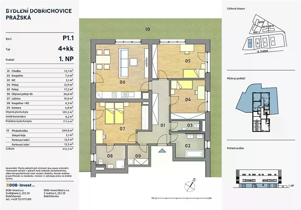 Nabízíme k prodeji byt 4+kk v novostavbě, která je součástí nového bytového komplexu na okraji města Dobřichovice. Tento byt se nachází v přízemí bytového domu „P“. Díky jeho pozici v přízemí domu je jeho součástí předzahrádka o cca 269,8 m². Ve výhradním užívání k němu pak také náleží zděný sklep umístěný ve vstupním podlaží domu o velikosti cca 2 m² a dále dvě parkovací stání umístěná na terénu před domem. V základním standardu jednotky jsou veškeré podlahy, obklady a koupelnová sanita. Byt je připojený na teplovodní centrální plynovou kotelnu umístěnou v přízemí objektu, v pokojích jsou osazena desková otopná tělesa, v koupelnách topné žebříky (doplněné el. patronou pro možnost dohřevu mimo topnou sezonu), v koupelnách je také elektrické podlahové vytápění (opět pro možnost přitápění nezávisle na topné sezoně). Ohřev teplé vody bude kromě plynu v letních měsících navíc zajišťován pomocí FV panelů umístěných na střeše objektu. V bytě je také instalována větrací jednotka s rekuperací tepla. Okna jsou plastová trojskla. Díky použitým moderním technologiím získala budova energetické hodnocení B - velmi úsporná. Prohlídky na stavbě zatím z bezpečnostních důvodů bohužel nenabízíme, vše důležité spolu ale můžeme probrat u nás v kanceláři. Pokud Vás byt zaujal, neváhejte nám napsat nebo zavolat, rádi se s Vámi setkáme osobně. V nabídce máme i další varianty bytů 4kk - s menší předzahrádkou nebo s prostorným balkonem - pro více info nás kontaktujte nebo navštivte oficiální stránky projektu.