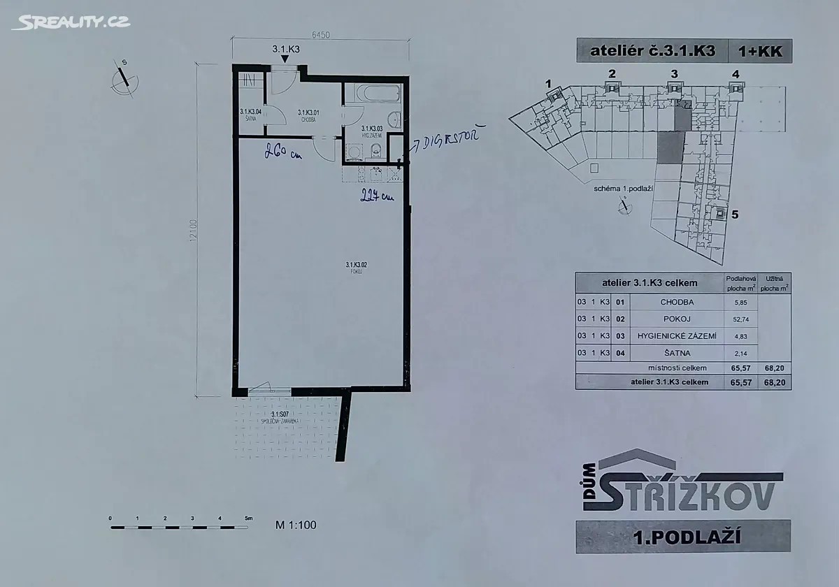 Nabízím k prodeji jedinečný ateliér 1+kk situovaný v cihlové stavbě ve velmi dobrém stavu, nacházející se v oblíbené části Prahy-Střížkov. Tento byt je ideální volbou pro jednotlivce nebo páry, kteří ocení moderní bydlení s možností relaxace na prostorné terase o velikosti 20 m². Byt disponuje užitnou plochou 68 m², což umožňuje pohodlné a flexibilní uspořádání interiéru. Jedním z hlavních předností tohoto bytu je jeho strategická poloha, která zajišťuje snadný přístup do centra Prahy a zároveň klidné okolí pro bydlení. Byt je veden v osobním vlastnictví a nabízí možnost parkování, což je v této lokalitě velkou výhodou. K dispozici je jedno parkovací místo. Z hlediska nákladů na bydlení je třeba počítat s měsíčními náklady ve výši 5.500 Kč. Tento ateliér nabízím v původním stavu s novou kuchyňskou linkou a vizualizace jsou možnou alternativou úpravy. Jsem schopen zařídit tuto úpravu. Byt je nyní pronajat. Vše vysvětlím telefonicky nebo osobně. Prohlídky jsou možné po předchozí domluvě. Pro více informací o této nemovitosti nebo sjednání prohlídky mne,prosím, kontaktujte.