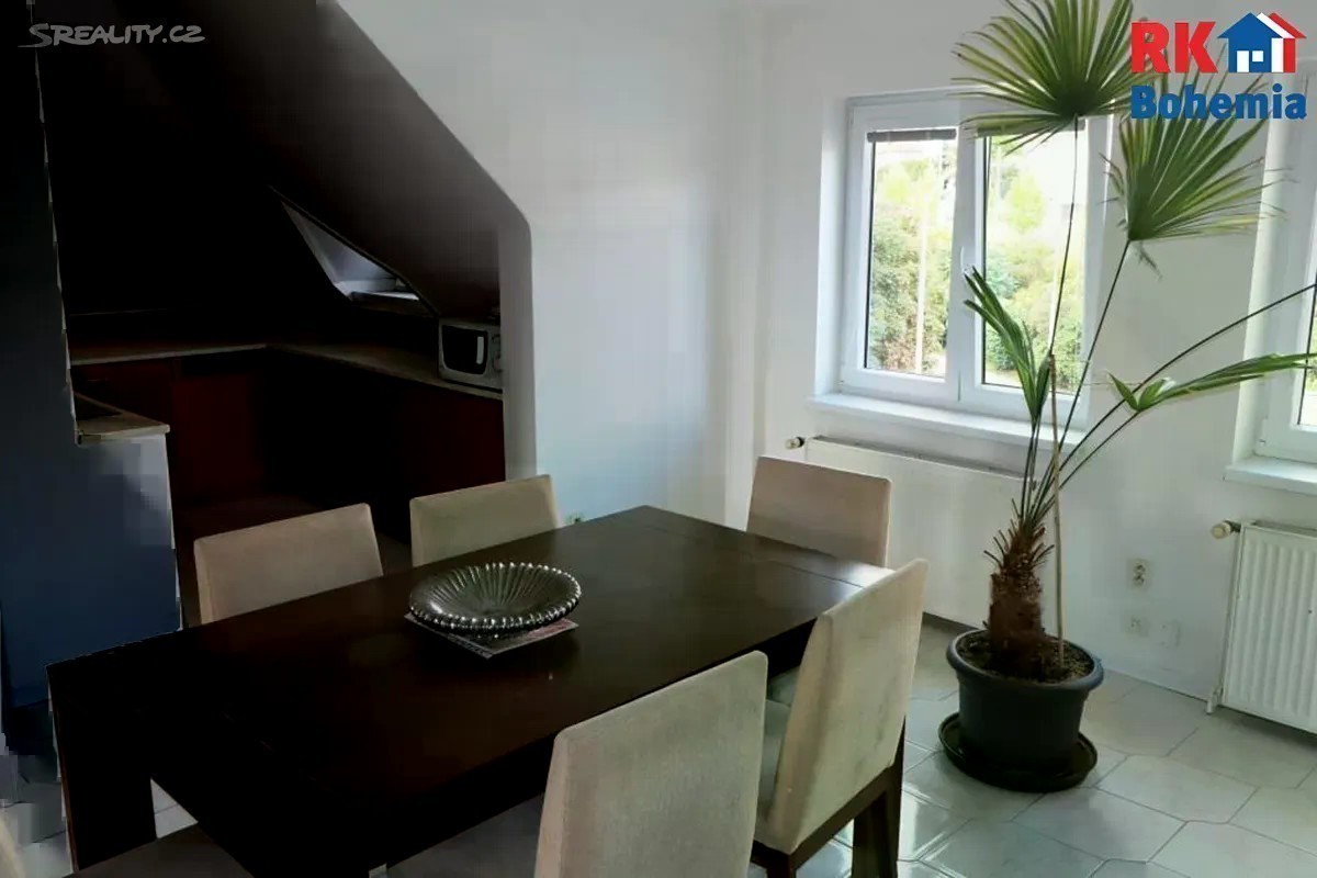 Nabízím exklusivně byt 3+kk a celkové užitné ploše 77m2 ve 3NP bez výtahu. K bytu je možnost parkování. Součástí je balkon ze kterého je výhled na úžasné panoráma Prahy a zahradu s možností žívání. Tento nadstandardní byt, který se nachází v rekonstruované činžovní vile s oplocenou zahradou možností vlastního parkovacího místa. Dům i byt je svým umístěním opravdu "exklusivní". Byt je vybavený kuchyňským koutem, který je plně vybavený, sklokeramickou deskou, lednicí, mrazákem, mikrovlnkou, myčkou. Tento kout je spojený se vtupní halou, která může sloužit, i jako velká jídelna. Koupelna je osazena sprchovým koutem, WC, umyvadlem a ve skříni je uložený zdroj vytápění bytu, plynový kotel. Další místnost může sloužit jako obývací pokoj, ze kterého je úžasný výhled na panorama Prahy, ale hlavně je propojený se vstupem na balkon a odtud máte úžasný výhled až na Pražský hrad a zahradu domu. Z tohoto obývacího pokoje se vchází do dvou menších pokojů. Jeden z nich je menší ložnice se zkoseným stropem a druhý by mohl sloužit, jako rozšíření této ložnice a nebo, dle potřeby třeba i jako šatna. Obrovským benefitem celého domu a bytu je jeho lokalita. Nacházíte se jen pár metrů od metra A Bořislavka a uprostřed veškeré občanské vybavenosti a MHD. Hanspaulka je jednou z nejlukrativnějších a nejvyhledávanějších čtvrtí v celé Praze. Nachází se uprostřed zeleně, parků, ale nabízí i bezproblémové spojení na letiště Václava Havla, nebo na Pražský okruh. Dalším benefitem je možnost užívání soukromé zahrady, posezení, grilování, ale i možnost parkování v oplocené soukromé zahradě a lokalitě kde je skoro nemožné naleznout parkovací místo. Tento byt je vhodný maximálně pro dvě osoby. Zálohohy na vodu, a užívání zahrady jsou v ceně podnájmu. Parkování 2500kč/měsíc. Převod El+plyn na Podnájemce. Hledáme pouze bonitní a pracující klienty k dlouhodobému podnájmu. Kauce jsou 2xpodnájem.Odměna RK za zprostředkování je jeden podnájem. V přízemí této stylové vily je možno pronajmout menší kancelář, o podlahové ploše 56m2, se vstupem do zahrady a další parkovací stání. Vřele doporučuji tuto zajímavou nemovitost. V případě zájmu neváhejte zavolat a nebo napsat do mailu s informacemi o vás.