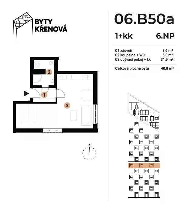 Přestavujeme Vám pokračování úspěšného projektu LOFT BLOK Křenová. Ikonická stavba, která přináší do centra města moderní design a výhledy, které vás nepřestanou bavit - Petrov, Špilberk i celé panorama Brna máte doslova na dosah. Tento projekt spojuje špičkovou architekturu, promyšlené dispozice a nadstandardní technické řešení. Ať už hledáte nový domov, nebo investici, která si drží hodnotu, tady najdete obojí - v té nejlepší brněnské lokalitě ve středu města. Bytová jednotka o dispozici 1+kk a velikosti 40,8 m2 se nachází v 6NP z celkových 16NP. Díky umístění ve vyšším podlaží se můžete těšit na krásný výhled směrem na město a dostatek denního světla. Standard bytu Světlé prostory, kvalitní vinylové podlahy a keramická dlažba Interiérové dřevěné dveře s obložkovými zárubněmi Bezbariérový přístup se dvěma výtahy Kompletní příprava na kuchyň a digestoř Klimatizace Centrální vytápění napojené na městskou teplárnu Optický internet, TV a audiotelefon u vstupu Možnost dokoupení garážového parkovacího stání a sklepní jednotky Jen pár kroků od Vašeho prahu naleznete kavárny, restaurace, obchody, dětská hřiště i zelené plochy pro relaxaci. Stačí nasednout na kolo a po přilehlé cyklostezce vyrazíte k brněnské přehradě či do klidných lesů Hádů. Moderní bydlení v centru Brna tak spojuje to nejlepší z nejlepší z - dynamiku velkoměsta a klid domova, který se Vám nikdy neomrzí. Do úplného centra Brna se dostanete za pár minut pěšky nebo tramvají, přičemž zastávky MHD se nacházejí v těsné blízkosti projektu. Hlavní vlakové a autobusové nádraží jsou vzdáleny jen pár minut chůze, což zajišťuje vynikající napojení nejen v rámci města, ale i na dálkové spoje. Autem jste na dosah městskému okruhu i nájezdům na dálnice D1 a D2. Ať už míříte do Prahy, Vídně nebo Bratislavy, hladké napojení Vám každý den ušetří cenný čas. Lokalita s vysokým potenciálem rozvoje - v blízkosti se plánují nové služby a vznikají další příležitosti, které zvýší komfort bydlení v docházkové vzdálenosti. Podívejte se na kompletní nabídku dalších jednotek na webu projektu BYTYKRENOVA.CZ - naleznete tam různé dispozice i velikosti, ze kterých si určitě vyberete. Předpokládaný termín dokončení je začátek roku 2027. Neváhejte nás kontaktovat - poradíme Vám s výběrem Vašeho vysněného bydlení či investice.