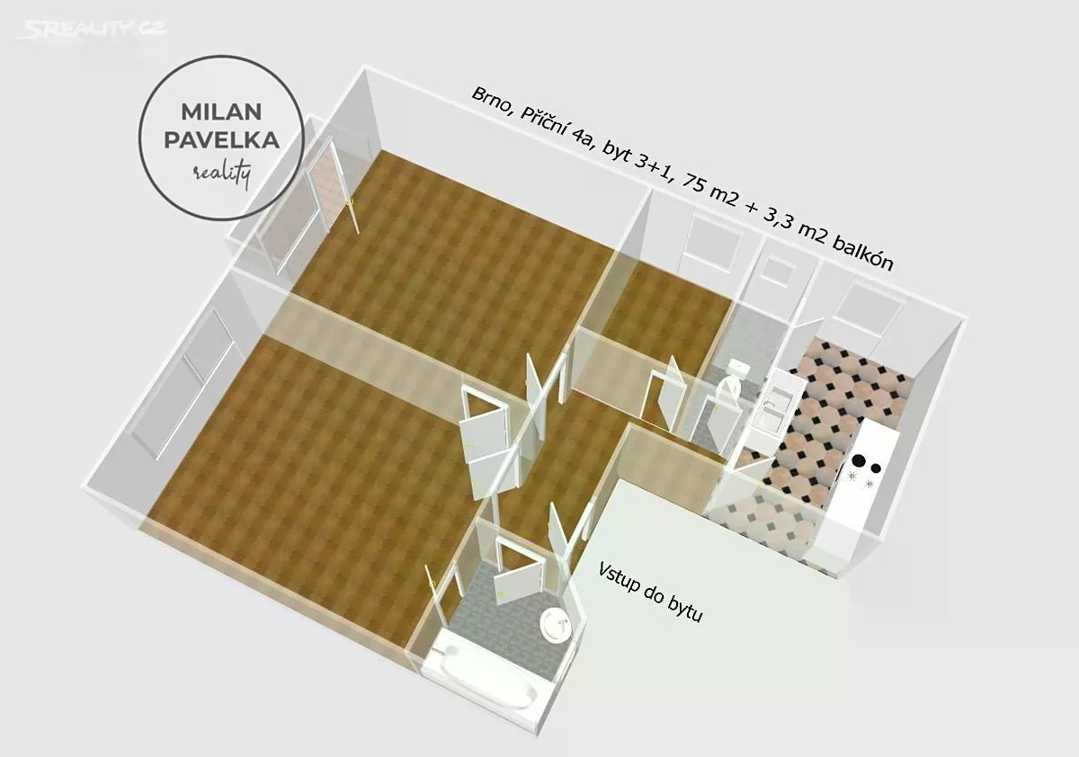 Hledáte bydlení v centru města Brna? Máte rádi staré časy a prvorepublikovou poctivou práci? Milujete město, zábavu, kulturu a společnost? Chcete mít všechny služby na dosah ruky? Pak je pro Vás nabízený byt 3+1 o ploše 75 m2 + balkón na Příční ulici, v městské části Zábrdovice jako stvořený. Bytový dům prošel kompletní revitalizací - okna, vchodové dveře, zateplení fasády, rozvody vody i elektřiny, moderní výtah. Byt se nachází v 5. NP (z celkových 7.NP). Na podlahách jsou zachovalé parkety a dlažba. Okna jsou plastová s izolačním dvojsklem se žaluziemi a sítěmi proti hmyzu. Vytápění je zajištěno ústředním topením - dálkovod. Výměry jednotlivých místností: pokoje 21,8, 23,7 a 5,6 m2 (může sloužit jako malá ložnice, dětský pokoj, pracovna nebo šatna), chodba 6,5 m2, kuchyně 10,2 m2, komora, WC, koupelna 4,5 m2 (viz přiložený půdorys). Celková výměra je 75 m2 + 3,2 m2 balkón. Součástí většího pokoje jsou původní dřevěné vestavěné skříně, které poskytují dostatek úložného prostoru. Chodba propojuje všechny místnosti v bytě - tedy dva velké pokoje, jeden malý pokoj, koupelnu, samostatné WC a kuchyni, na niž navazuje praktická komora. V koupelně si můžete dopřát relaxaci ve vaně nebo v zimě sušit prádlo na závěsném sušáku pod stropem. V kuchyni pak najdete zachovalou původní dlažbu a novou kuchyňskou linku. Pohodlné bydlení zajistí i vysoké stropy (2,9 m) a skutečnost, že je byt světlý a vzdušný. Slunečným jihozápadem se můžete kochat na pohodlné dřevěné lavičce z balkónu, který je po renovaci. K bytu náleží sklepní kóje v 1.PP (3,2 m2) na uložení kol či sportovního vybavení nebo předmětů, kterých se ještě nechcete úplně zbavit, ale nepotřebujete je mít ihned po ruce. Měsíční náklady na bydlení jsou 5.909 Kč (fond oprav, správa a provoz domu 1.515 Kč, studená a teplá voda 477 Kč, teplo 3.544 Kč, ostatní položky 373 Kč) + elektrická energie a plyn na vaření. Průkaz energetické náročnosti budovy skupina C. Dům navíc obklopuje zahrada ve vnitrobloku s možností posezení a předzahrádka z ulice Příční. Byt je vhodný pro všechny, kteří hledají kus historie, klid, závan přírody a současně ocení dostupnost centra Brna. Byt je okamžitě k dispozici a je ihned obyvatelný a je bez jakýchkoliv omezení vlastnických práv.