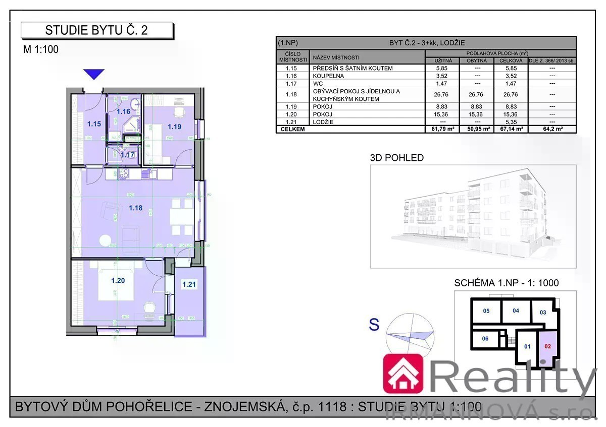 Novostavba bytu 3+kk s řízeným systémem měření a regulace vytápění a ohřevu teplé vody, se nachází ve 1. nadzemním podlaží bytového domu s výtahem. Celková plocha bytu je 67,14 m2 včetně lodžie. Podlahová plocha je 63,9 m2. Součástí každé bytové jednotky je klimatizace. Bytový dům obsahuje 42 nových bytových jednotek o vel. 3+kk a 2+kk, 14 sklepních boxů, 3 zděné sklepy, 8 vnitřních garážových stání, kočárkárnu - kolárnu, technické zázemí, 4 samostatné zděné garáže, 40 venkovních garážových stání. Bytový dům nabízí 4. NP a 1. PP.