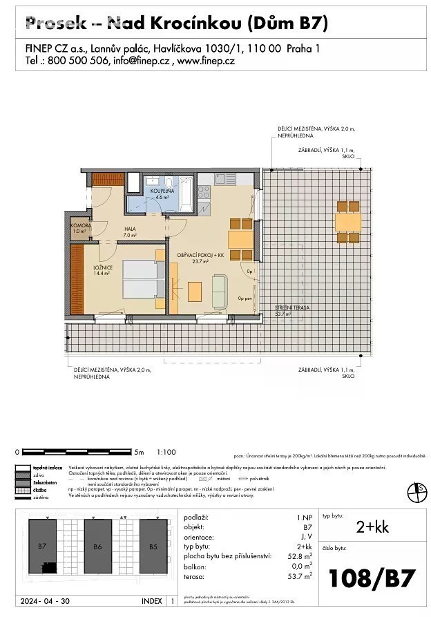 Nabízíme k prodeji byt 2KK s prostornou terasou v osobním vlastnictví v developerském projektu Krocinka dům B7, od společnosti Finep. Dům se nachází na ulici Návarovská. Užitná plocha bytu je 52,8 m2 + terasa 53,7 m2. Byt se nachází v prvním patře domu B7 a má orientaci na jih a východ. Projekt Krocinka nabízí vynikající dostupností, pouze jednu minutu chůze od stanice metra C - Prosek. V blízkosti je kompletní občanská vybavenost, jako: poliklinika, školy, školky a obchody a supermarkety Prosecký park je ideálním pro sport a odpočinek. Byt bude dokončen v druhé polovině roku 2027. Klientské změny jsou stále možné. Skvělá investiční příležitost. Na byt bude poskytnuta záruka 3 roky. Jedná se o prodej formou postoupení smlouvy o budoucí kupní smlouvě od developera. Nyní hradíte pouze cena za postoupení ve výši 2 859 657. Doplatek kupní ceny ve výši 6 040 643,-Kč je možné hradit formou hypotečního úvěru až po kolaudaci domu. K bytu je možné dokoupit garážové stání v 1PP. V projektu můžeme nabídnout ještě další dva byty 2KK ve druhém a třetím patře a jeden byt 3KKK ve třetím patře. V případě dalších dotazů nás neváhejte kontaktovat.