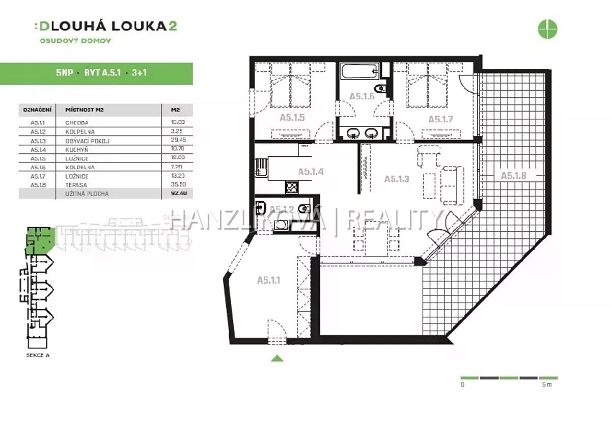 Nabízíme k prodeji nadstandardní bytovou jednotku číslo A.5.1. Jedná se o byt 3+1 o výměře 92,40 m2 + terasa 35,50 m2, který se nachází v 5.NP nového rezidenčního komplexu DLOUHÁ LOUKA 2.etapa. Byt se skládá z: prostorné chodby, koupelny, samostatné toalety, dvou samostatných pokojů a prostorného obývacího pokoje s kuchyní a jídelnou. Byt je orientovaných na východ. Z obývacího pokoje a ložnice je přístup na velkou terasu (35,50m2). Byt zůstane částečně zařízený - kuchyňská linka včetně spotřebičů, jídelní stůl, židle, sedací souprava, skříně. Dům je vybaven dvěma výtahy, videotelefony, kabel. rozvody, internetem. V přízemí jsou umístěny parkovací stání a společné prostory - kolárna, kočárkárna. Byt bude k dispozici do konce roku. Vyhrazené parkovací stání je možné si dlouhodobě pronajmout. Ideální poloha v centru krajského města a přesto uprostřed zeleně vytváří z bytů na DLOUHÉ LOUCE osudový domov. Vhodná orientace komplexu zajišťuje majitelům bytů výhledy na řeku Vltavu a historické centrum Českých Budějovic.