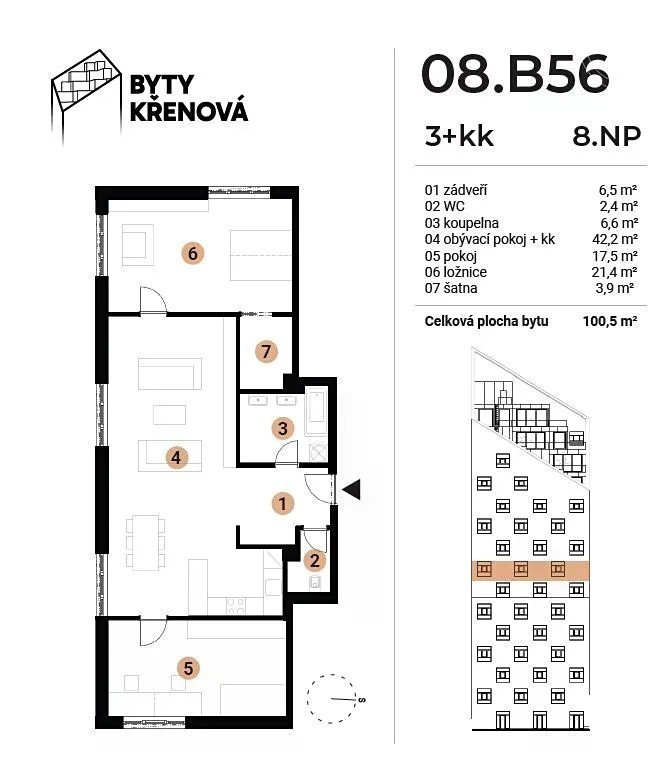 Přestavujeme Vám pokračování úspěšného projektu LOFT BLOK Křenová. Ikonická stavba, která přináší do centra města moderní design a výhledy, které vás nepřestanou bavit - Petrov, Špilberk i celé panorama Brna máte doslova na dosah. Tento projekt spojuje špičkovou architekturu, promyšlené dispozice a nadstandardní technické řešení. Ať už hledáte nový domov, nebo investici, která si drží hodnotu, tady najdete obojí - v té nejlepší brněnské lokalitě ve středu města. Bytová jednotka o dispozici 3+kk a velikosti 100,5 m2 se nachází v 8.NP z celkových 16.NP. Díky umístění ve vyšším podlaží se můžete těšit na krásný výhled směrem na město a dostatek denního světla. Standard bytu Světlé prostory, kvalitní vinylové podlahy a keramická dlažba Interiérové dřevěné dveře s obložkovými zárubněmi Bezbariérový přístup se dvěma výtahy Kompletní příprava na kuchyň a digestoř Klimatizace Centrální vytápění napojené na městskou teplárnu Optický internet, TV a audiotelefon u vstupu Možnost dokoupení garážového parkovacího stání a sklepní jednotky Jen pár kroků od Vašeho prahu naleznete kavárny, restaurace, obchody, dětská hřiště i zelené plochy pro relaxaci. Stačí nasednout na kolo a po přilehlé cyklostezce vyrazíte k brněnské přehradě či do klidných lesů Hádů. Moderní bydlení v centru Brna tak spojuje to nejlepší z nejlepší z - dynamiku velkoměsta a klid domova, který se Vám nikdy neomrzí. Do úplného centra Brna se dostanete za pár minut pěšky nebo tramvají, přičemž zastávky MHD se nacházejí v těsné blízkosti projektu. Hlavní vlakové a autobusové nádraží jsou vzdáleny jen pár minut chůze, což zajišťuje vynikající napojení nejen v rámci města, ale i na dálkové spoje. Autem jste na dosah městskému okruhu i nájezdům na dálnice D1 a D2. Ať už míříte do Prahy, Vídně nebo Bratislavy, hladké napojení Vám každý den ušetří cenný čas. Lokalita s vysokým potenciálem rozvoje - v blízkosti se plánují nové služby a vznikají další příležitosti, které zvýší komfort bydlení v docházkové vzdálenosti. Podívejte se na kompletní nabídku dalších jednotek na webu projektu BYTYKRENOVA.CZ - naleznete tam různé dispozice i velikosti, ze kterých si určitě vyberete. Předpokládaný termín dokončení je začátek roku 2027. Neváhejte nás kontaktovat - poradíme Vám s výběrem Vašeho vysněného bydlení či investice.