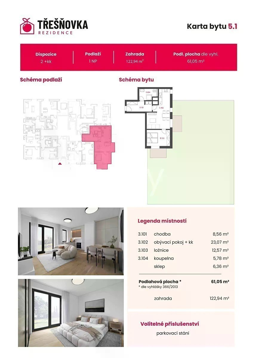 Moderní byty v Rezidenci Třešňovka - Nový život ve vilové čtvrti s výhodami města. Máme tu pro vás jedinečnou příležitost zažít pohodlný život ve vysoce kvalitním bytě v novém developerském projektu Rezidence Třešňovka. Tento moderní bytový dům s názvem Rezidence Třešňovka bude dominantou uzavřeného rezidenčního areálu na okraji prestižní vilové čtvrti města Kolín ve středočeském kraji s bezprostřední blízkostí občanské vybavenosti. Vlastní životní styl Uzavřený rezidenční areál s parkovištěm a parkovou úpravou. Možnost elektronabíječky pro auta přímo v areálu. Lavičky a slunečníky pro relaxaci v příjemném prostředí. Dětské hřiště pro radost nejmenších obyvatel. Moderní bydlení 4 patra a jedno podzemní podlaží s nebytovými prostory a sklepními kójemi. Kamerový systém pro maximální bezpečnost. Příprava na předokenní žaluzie. Zateplení pro úsporu energií. Plastová okna s trojskly pro optimální izolaci. Elektronický vjezd a 2 vstupní branky pro omezený přístup. Orientace bytů Primárně jižní a západní orientace pro optimální osvětlení. V tomto případě nabízíme jednotku 3+kk o podlahové ploše 64,91 m² (dle vyhl. 366/2013 Sb.), která se nachází v 1. NP a je členěná na vstupní chodbu (4,11 m²), obývací pokoj + kk (20,32 m²), ložnici (12,75 m²), pokoj (13,05 m²) koupelnu (3,35 m²), WC (1,50 m²). Zahrada 71,68 m² bude oplocená se vstupní brankou. Vybavení bytů Předzahrádka Kvalitní podlahy a velkoformátové obklady. Moderní sanitární technika Příprava na kuchyňskou linku ve spolupráci se společností ORESI. Pohodlí a parkování Možnost dokoupit parkovací stání přímo v areálu. Nenechte si ujít příležitost stát se součástí prestižního projektu Rezidence Třešňovka a zažít nový standard bydlení v Kolíně. Pro více informací a schůzku nás neváhejte kontaktovat. Vaše nové bydlení na vás čeká. Výstavba zdárně pokračuje, dokončení je reálné ve 4Q 2025. Financování zajistí naši hypotéční specialisté. Pravidelně budeme pořádat dny otevřených dveří, které budou blíže specifikovány na webových stránkách projektu. Těšíme se na viděnou. Za Rezidenci Třešňovka Martin Nesládek