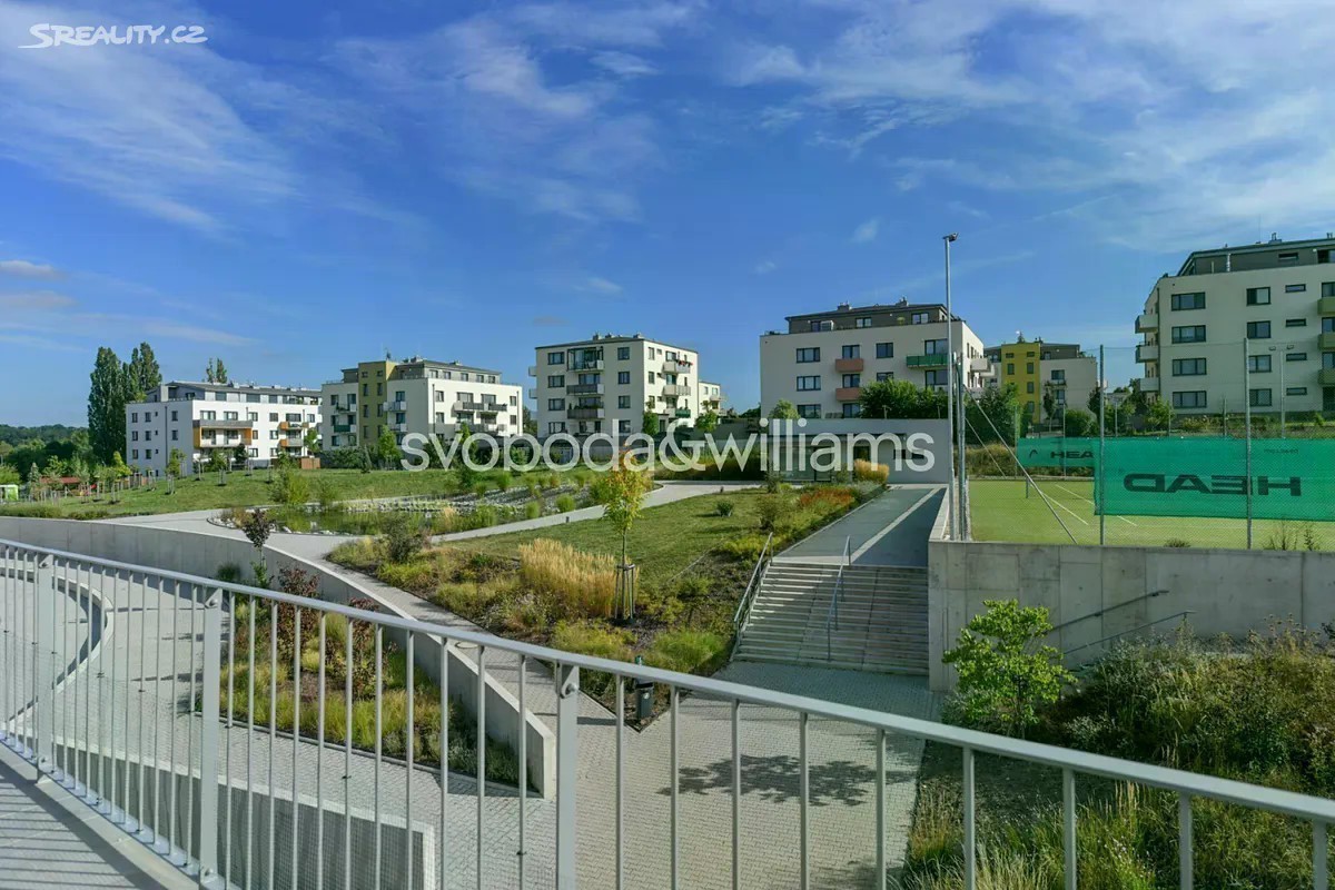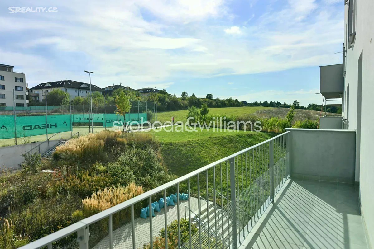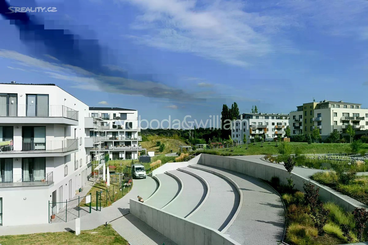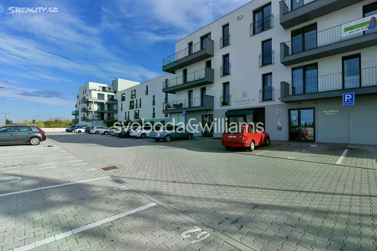 Nabízíme k pronájmu nový zařízený byt s terasou, situovaný ve 2. patře novostavby Rezidence Velvaria s výtahem a parkováním. Budova se nachází v klidné přírodní lokalitě v Praze Horoměřicích, v místě s rychlou dostupností do mezinárodních škol ISP a Riverside School. V okolí je k dispozici dobrá občanská vybavenost, pár kroků od domu je autobusová zastávka s pravidelnými spoji ke stanici metra Bořislavka (11 minut jízdy). Letiště Václava Havla je vzdáleno cca 15 minut jízdy autem. Interiér tvoří obývací pokoj s plně vybavenou kuchyní a jídelním prostorem, ložnice, pracovna / druhá ložnice, koupelna s vanou, samostatná toaleta, šatna / úložná komora a vstupní chodba. Terasa je přístupná z obývacího pokoje a jedné ložnice. Klimatizace v obývacím pokoji, rekuperace, laminátové podlahy, dlažba, centrální vytápění, sítě proti hmyzu, pračka, sušička, kuchyň Hanák, myčka, indukční varná deska, granitový dřez, mikrovlnná trouba, zahradní nábytek. V ceně je zahrnuto garážové stání.