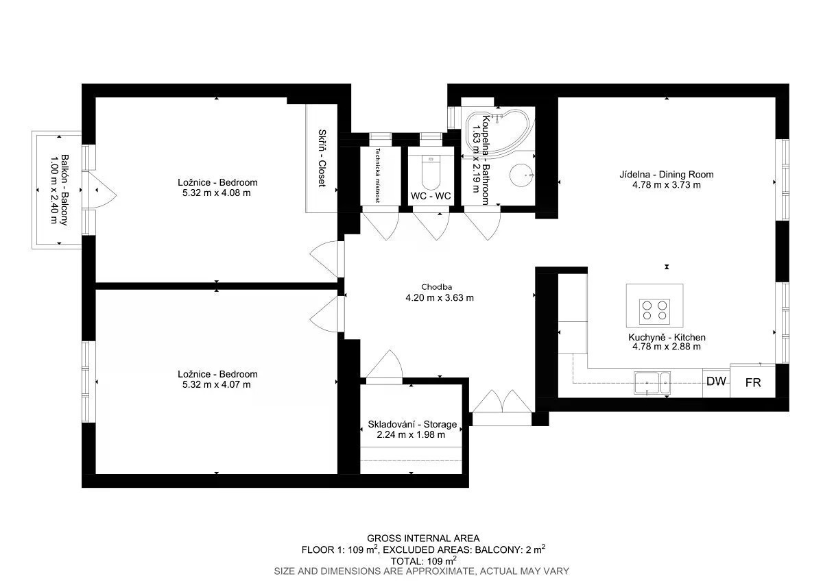 Nabízíme k prodeji světlý a prostorný byt 3+kk s balkonem, nacházející se na ulici Rybníček v Brně - Králově Poli. Byt o celkové podlahové ploše 109,32 m² (započitatelná plocha 106,84 m²) se nachází v 5. nadzemním podlaží cihlového domu. Dispozičně je řešen velmi prakticky, všechny místnosti mají samostatné vstupy ze vstupní haly (15,5 m²). Obývací pokoj s kuchyňskou částí (27,5 m²) je orientován do klidného vnitrobloku. Ložnice (20,8 m²) disponuje balkonem (2,5 m²) a vestavěnou šatní skříní na míru. Další pokoj (20,5 m²) je vhodný jako dětský pokoj. Prostorná koupelna (13,6 m²) nabízí dostatek místa pro vanu i sprchový kout. Dále se v bytě nachází samostatná šatna/pracovna (4 m²), technická místnost (1,2 m²) a samostatné WC (1,2 m²). Byt se prodává jako nevybavený, součástí však zůstává kuchyňská linka včetně samostatně stojící lednice, klimatizace v ložnici a pokoji, vestavěná skříň v ložnici, šatní skříň v šatně a úložné prostory na chodbě. Podlahy v obytných místnostech jsou plovoucí lamino, v kuchyni keramická dlažba. Vstupní dveře jsou bezpečnostní, dvoukřídlé, okna plastová. Vytápění a ohřev vody zajišťuje plynový kondenzační kotel, který je napojen na Wi-Fi a umožňuje dálkové ovládání přes aplikaci. K bytu náleží sklep v 1. podzemním podlaží. V domě není výtah. Lokalita nabízí skvělou občanskou vybavenost i výbornou dostupnost do centra města. V docházkové vzdálenosti se nachází zastávka tramvají Hrnčířská (linky 1 a 6), park Lužánky, nákupní centrum SFINX (Albert, čistírna, lékárna), ZŠ a MŠ Staňkova, Bobycentrum, Fakulta informatiky MU a mnoho dalších služeb. Kompletní měsíční náklady na provoz bytu činí 7 165 Kč. Uvedené výměry jsou pouze orientační. Veškeré zveřejněné údaje v tomto inzerátu mají pouze informativní charakter a nejsou nabídkou ve smyslu § 1731 nebo § 1732 občanského zákoníku, ani se nejedná o veřejný příslib dle § 1733 občanského zákoníku. Pro více informací nebo domluvení prohlídky nás neváhejte kontaktovat.