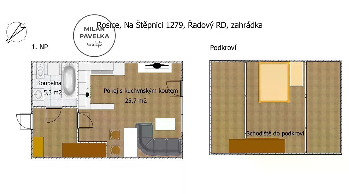 Hledáte místo pro bydlení v řadovém rodinném domě s terasou a zahrádkou, který je nízkonákladový a je s dobrým dosahem města a dostupností vlakem například do Brna? Hledáte menší rodinný dům, kde není nutné dělat žádnou rekonstrukci a stačí se jen nastěhovat? Právě Vám nabízím řadový rodinný dům o celkové užitné ploše 67,5 m2 s terasou a zahrádkou v okrajové části města Rosice. Dle ústního sdělení majitele byl rodinný dům kolaudovaný v roce 2000. Po vstupu do zádveří, odkud je vstup do koupelny s WC o výměře 5,3 m2 a schodiště do podkroví, dále před Vámi se otevře světlý a prostorný obývací pokoj s kuchyňským koutem o výměře 25,7 m2 a dále vstup na terasu s posezením a se zahrádku o celkové výměře 24 m2. Podkroví o užitné ploše 29,9 m2 včetně úložného prostoru pod šikmou střechou je aktuálně klidové místo pro spaní. Celková užitná plocha domu tedy je 67,5 m2 + zahrádka s posezením 24 m2. Vytápění domu a ohřev vody je plynovým kotlem. Okna jsou plastová s izolačním dvoj sklem. Fasáda domu byla realizováno v roce 2020. Jako podlahová krytina jsou použity dlažba a plovoucí podlaha. Průkaz energetické náročnosti: třída D. Cena domu 5.600.000 Kč bez vybavení a 5.700.000 Kč včetně veškerého vybavení. Rosice jsou město v okrese Brno-venkov v Jihomoravském kraji, 16 km Z od Brna. Leží v katastrálním území Rosice u Brna, tento název nese i místní pošta a železniční zastávka. Žije zde přibližně 6 800 obyvatel. Je zde veškerá občanská vybavenost. MŠ, ZŠ, obchod s potravinami, restaurace, městský úřad, pošta, lékárna a mnohé další. Dopravu zajištují autobusy a vlaky IDS JMk. Nabízím možnost zdarma využít služeb poradce, který Vám nezávazně poradí v oblasti hypotečních úvěrů, stavebního spoření, podnikatelských úvěrů a všech forem pojištění.