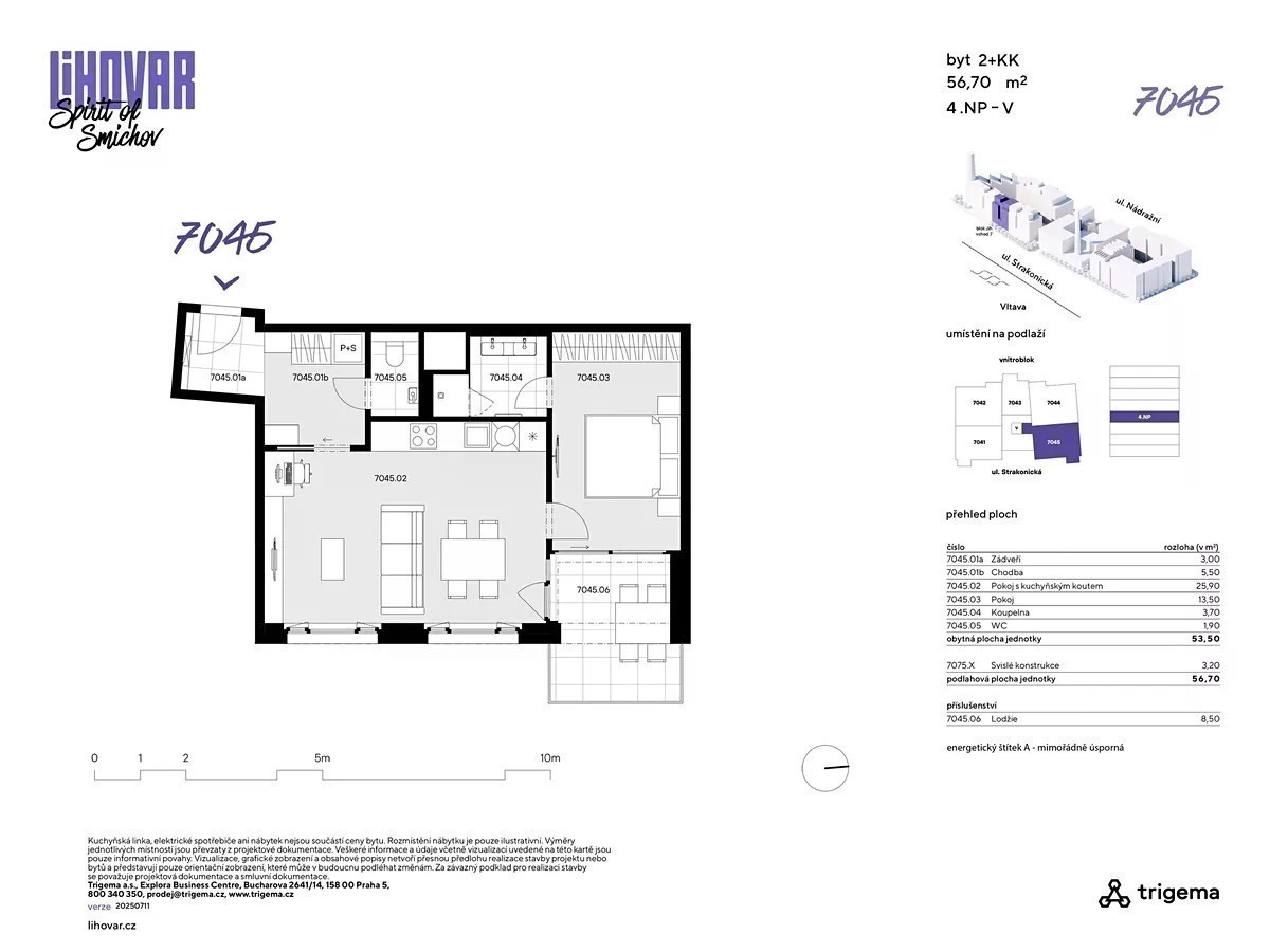 Staňte se součástí výjimečného projektu! Smíchov se mění - a vy můžete být u toho. Třetí a zároveň poslední etapa výjimečného projektu uzavírá vznik nové čtvrti, kde se industriální styl snoubí s moderní architekturou. Na místě vyroste živý prostor plný obchodů, služeb a kulinářských zážitků v rámci rozsáhlého food courtu. Nový Dvorecký most propojí Smíchov s Podolím a rekonstrukce Smíchovského nádraží dodá celé lokalitě ještě větší hodnotu. Prémiové byty od renomovaného developera Trigema ve vyšších patrech nabídnou neopakovatelné výhledy na Vltavu, Vyšehrad a Pankrác. Poslední šance stát se součástí místa, které definuje budoucnost této části Prahy. Příjemné 2+kk se západní orientací velkorysou terasou (41,60 m2) Byt č. 7024 o dispozici 2+kk a celkové podlahové ploše 58,20 m² se nachází v 2. nadzemním podlaží a je orientován na západ, což zajišťuje dostatek odpoledního slunečního světla a příjemnou atmosféru. Obytná plocha bytu činí 54,90 m², doplněná o svislé konstrukce. • Terasa 41,60 m2 • Promyšlená dispozice s oddělenou toaletou • Praktické vnitřní uspořádání • Energetická třída A - mimořádně úsporná O pohodlí se starají moderní technologie - rekuperace, stropní chlazení, exteriérové žaluzie či izolační trojskla. Vše je řízeno chytrým systémem Loxone, který zajišťuje příjemné a úsporné bydlení v každém ročním období. Byty v LIHOVARU jsou navrženy pro maximální komfort a praktičnost. Každý byt má vlastní terasu nebo lodžii. Promyšlené dispozice přinášejí dostatek světla a vzdušnost, přičemž ideální domov tu najde jak náročný singl, tak rodina s dětmi. Fotografie interiéru jsou pouze referenční. Pro prohlídku nemovitosti kontaktujte makléře společnosti. Nabídka dalších bytů na stránkách developerského projektu.