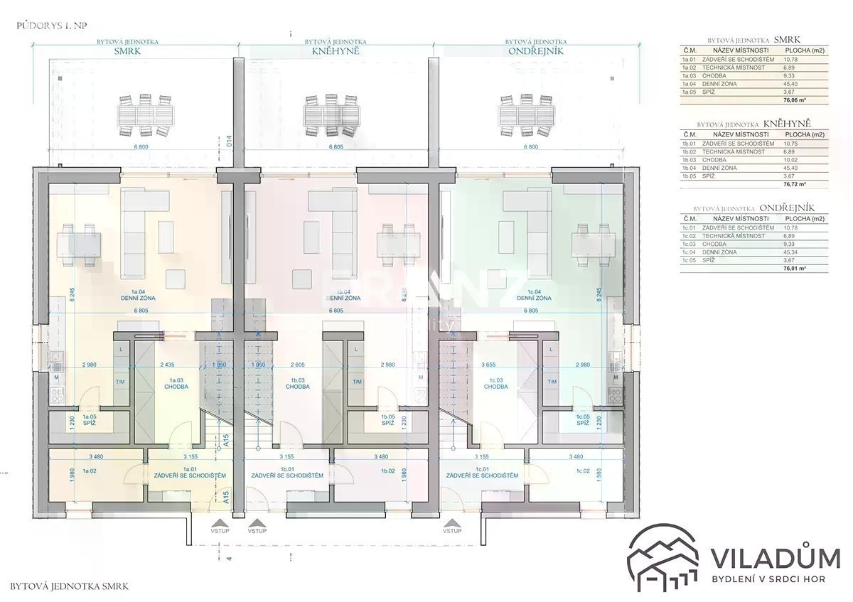 Již jen 2 bytové jednotky k prodeji Exkluzivní příležitost k bydlení v srdci Beskyd v jednotce pojmenované po Beskydském vrcholku Kněhyně. Developerských projektů je v okolí Beskyd přehršel, ale málo který, nabízí tak velkou podlahovou plochu a užitnou hodnotu jako bytové jednotky v projektu VILADŮM Čeladná. Představujeme vám jedinečný developerský projekt v Čeladné, kde se snoubí moderní architektura s krásami okolní přírody. Na místě bývalého domu č. p. 28 vzniká nový projekt řadového domu, který nabízí tři prostorné bytové jednotky v uzavřeném a zabezpečeném areálu. Fakt, že se jedná o bydlení skutečně v srdci Beskyd, podtrhuje pojmenování jednotlivých jednotek právě po slavných beskydských vrcholech - Smrk, Kněhyně a Ondřejník. Prostřední jednotka Kněhyně disponuje: • Terasou se vstupem z obývací pokoje, vlastní oplocenou zahradou pro vaše soukromí a relaxaci o velikosti 392,6 m² • Dvěma parkovacími místy zajišťující pohodlné parkování a další prostor pro stavbu například garáže nebo skladu o celkové ploše 44 m² Moderní technologie a komfort: • Stavba je navržena s důrazem na nízkou energetickou náročnost díky zdivu YTONG 375 a zateplení 200 EPS. Je opatřena sedlovou střechou s krytinou z hliníkových falcovaných plechů. • Teplovodní podlahové vytápění s tepelným čerpadlem, lokální rekuperace, předokenní rolety. Příprava na klimatizaci, krb nebo krbová kamna a fotovoltaiku zajistí moderní a úsporné bydlení. • Každý byt má vlastní nádrž na dešťovou vodu a navíc je zde i studna, pro potřeby společné části pozemku nebo omývání aut, což podporuje ekologický přístup k hospodaření s vodou. Interiér, který si zamilujete: • Praktická dispozice 5+kk s opravdu velkorysou podlahovou plochou 188 m² rozšířená o dalších 27 m² zastřešenou terasou, Nabízí prakticky navržený prostor s dostatkem úložného prostoru. V přízemí o podlahové ploše 76 m2 se nachází zádveří se schodištěm, technická místnost s toaletou a sprchou, chodba s praktickým úložným prostorem, velkorysý 45 m2 velký obývací pokoj se vstupem na krytou terasu a kuchyňský kout s praktickou spižírnou. Ve 2. podlaží jsou k dispozici dva pokoje 16,5 a 14,5 m2, ložnice 16,5 m2 a koupelna s vanou a sprchovacím koutem. Ale tím ještě nekončíme, V podkroví je dále k dispozici plnohodnotný pokoj s podlahovou plochou 37 m2 vhodný jako prostorná pracovna, herna nebo pokoj pro děti. Tento projekt je ideální volbou pro ty, kteří hledají moderní bydlení v klidné lokalitě s veškerou občanskou vybaveností na dosah ruky. Nechte se okouzlit tímto jedinečným místem, kde najdete domov pro sebe a svou rodinu. Dům bude dotáhnut do fáze kolaudace, čili bez kuchyňské linky a vestavěného nábytku, bez krbových kamen a jednotek klimatizací a Fve, ale vše s kompletní přípravou, Dle dohody možno dodělat kompletně na klíč. Plánovaný termín kolaudace přelom roku 2026/2027. Kontaktujte nás pro více informací a osobní prohlídku!