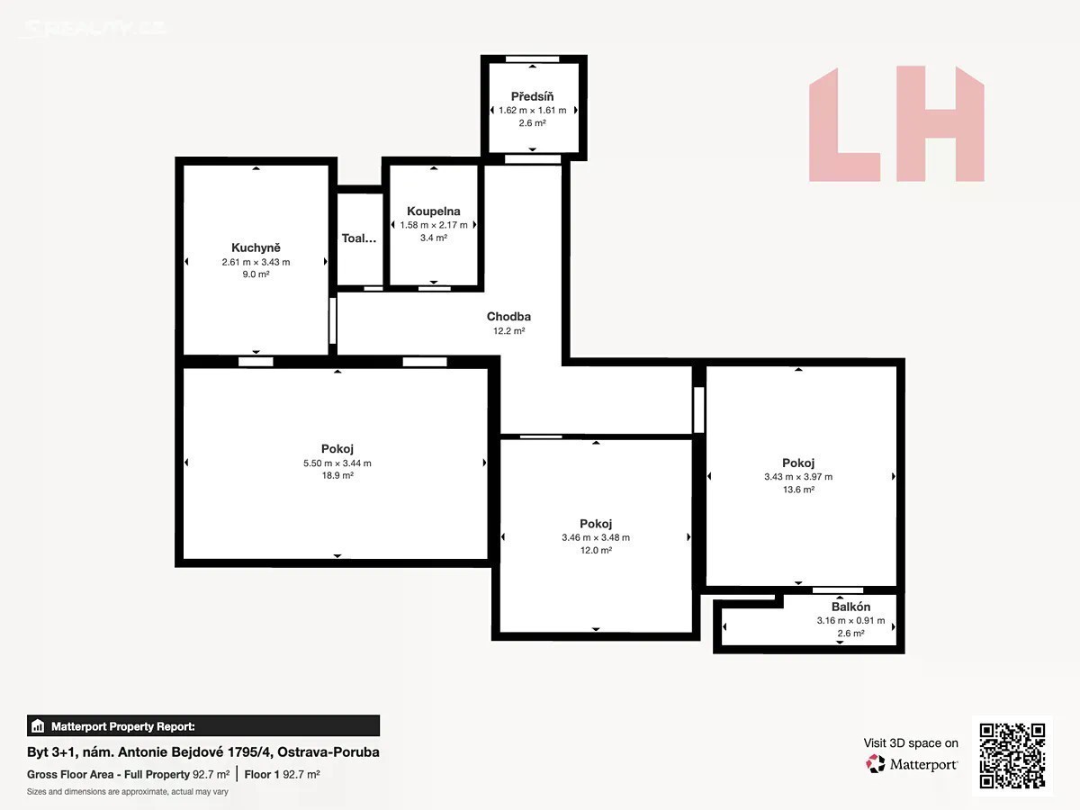 Nabízíme Vám ke koupi byt 3+1 s lodžií v dr. vl. (bez možnosti převodu do os.vl.) v Ostravě - Porubě na ul. náměstí Antonie Bejdové. Byt se nachází v 3NP revitalizovaného domu. V domě jsou dva výtahy. V bytě se nachází 3 neprůchozí místnosti, kuchyně, koupelna, WC, chodba a zasklená lodžie. K bytu náleží sklep. U zadního vchodu je k dispozici plošina pro invalidní vozík. Součástí inzerce je virtuální prohlídka. Uvedené výměry jsou orientační. Majitel si vyhrazuje právo prodat nejvýhodnější nabídce. Veškeré zveřejněné údaje obsažené v tomto inzerátu mají pouze informativní charakter a nejsou nabídkou ve smyslu § 1731 nebo § 1732 občanského zákoníku, ani se nejedná o veřejný příslib dle § 1733 občanského zákoníku.
