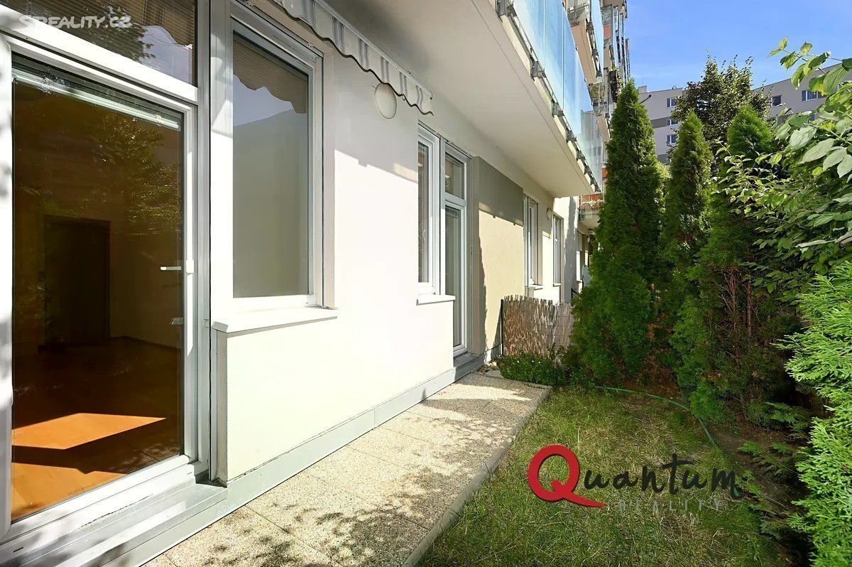 Exkluzivně nabízíme k dlouhodobému pronájmu velmi pěkný a světlý byt 2+kk o výměře cca 49 m2 s předzahrádkou 22 m2, situovaný v přízemí (ve společné, uzamykatelné chodbě) moderního domu v rezidenci Krásná hůrka z r. 2009, s bezpečnostní ostrahou areálu 24/7, a nachází se ve velmi žádané lokalitě přímo u stanice metra Hůrka. Byt se nabízí nezařízený, k dispozici je prostorná kuchyňská linka na míru se spotřebiči zn. Bosch (indukční varná deska, multifunkční horkovzdušná trouba, digestoř, myčka a lednice s mrazákem). V koupelně s WC je vana, otopný žebřík, podlahové topení, velká zrcadlová skříňka, skříňka pod umyvadlem a přípojka na pračku. Podlahy jsou dřevěné a dlažba, vytápění ústřední - ovládané termostatem v bytě, okna plastová se žaluziemi, venkovní elektrické rolety a markýza. Výměra místností: obýv. pokoj + kuch. kout - 23,06 m2, ložnice 15,53 m2, koupelna 5,74 m2 a předsíň 4,29 m2. Stropy vysoké 3 m. Orientace na jih, přístup na předzahrádku z obou pokojů. V domě je k dispozici kočárkárna a kolárna. Jedná se o velmi vyhledávanou lokalitu s dostatkem parků (např. Centrální park, Prokopské údolí, Vidoule) a zeleně vůbec, vynikající dostupností a veškerou občanskou vybaveností v místě - obchody Globus, Albert, Kaufland, OC Galerie Butovice, restaurace, polikliniky, lékárny, MŠ, ZŠ atd. Metro Hůrka je 5 minut chůze a metro Nové Butovice jen o kousek dál. Měsíční poplatky 3.800 Kč jsou uvedeny pro 2 osoby + 500 Kč další osoba + převod el. na nájemce (cca 1.000 Kč). Kauce ve výši 2 nájmů. Pouze pro nekuřáky. Ihned k nastěhování.
