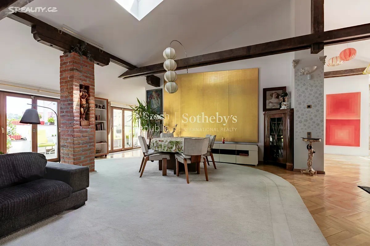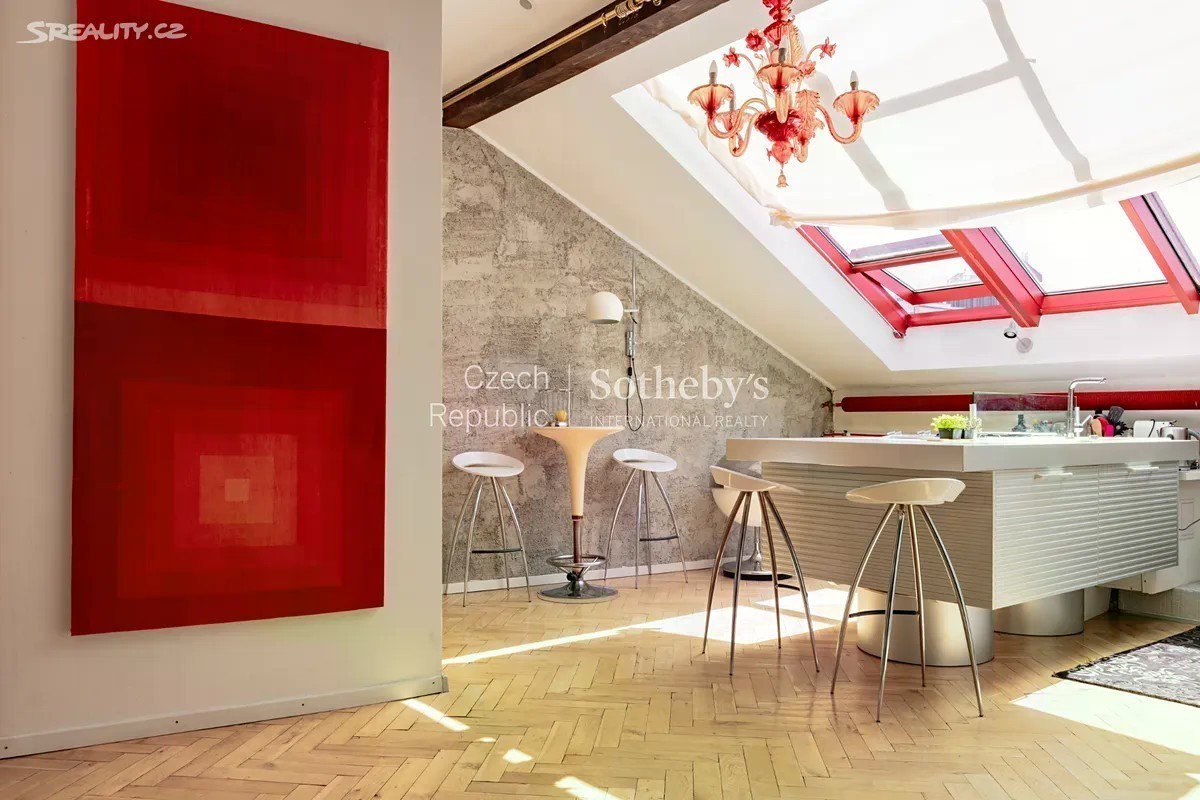 Sotheby's Int. Realty Czech Republic nabízí pronájem výjimečného penthousu o velikosti 206 m2 a terasami, jen pár kroků od Staroměstského náměstí. Jedinečný penthouse s atmosférou umělecké galerie se nachází v posledním patře historického činžovního domu s nově vybudovaným výtahem. Celková obytná plocha bytu činí 178 m2, opomenout však nelze ani částečně zastřešenou terasu o velikosti 22 m2, nabízející dechberoucí výhledy na Pražský hrad a střechy okolních domů. K bytu také náleží dva praktické sklepy o výměře 6 m2. Hlavní dominantou bytu je velkorysý obývací pokoj s ateliérovými okny a nadstandardní velikostí 80 m2. Zmiňovaná ateliérová okna jsou dále i v hlavní ložnici a jsou vybavena dálkovým ovládáním. Společenská část bytu pak volně přechází v prostornou kuchyni, vybavenou spotřebiči Miele a Gagenau, a vzdušným jídelním prostorem s druhou menší kuchyní, která může sloužit k zajištění občerstvení při stolování na terase. Penthouse poskytne budoucímu majiteli luxusní hlavní ložnici o velikosti 48 m2, k níž náleží i soukromá koupelna se stylovou volně stojící vanou. V bytě se nachází i druhá ložnice, která může případně sloužit jako pokoj s hosty, i k té náleží vlastní koupelna. Byt navíc disponuje prostornou technickou místností a separátní toaletou pro hosty. Tento unikátní apartmán je plně vybavený a po dohodě s majitelem je možné přenechat stávající historický nábytek nebo byt převzít nevybavený. Velkou výhodou technického vybavení bytu je klimatizace obou ložnic a kuchyně. V rámci technického zázemí je zde přítomnost prádelny/technické místnosti o velikosti 16 m2. - Obytná plocha 178 m2 - Terasa 22 m2 - Zařízeno - Klimatizace - Centrum města - Výhled - Výtah - Sklep Lokalita - Praha 1, Staré Město Dušní ulice, spojnice mezi nábřežím Na Františku a Dlouhou ulicí, nese své jméno podle tehdejšího kostela sv. Ducha z roku 1346, jehož území bývalo jádrem Židovského Města pražského. Dnes je tato část Starého Města spojována s nejprominentnějšími nákupy v Pařížské ulici a designovými obchody, s butiky módních návrhářů spolu s útulnými kavárnami a uměleckými galeriemi v těsné blízkosti Staroměstského náměstí.