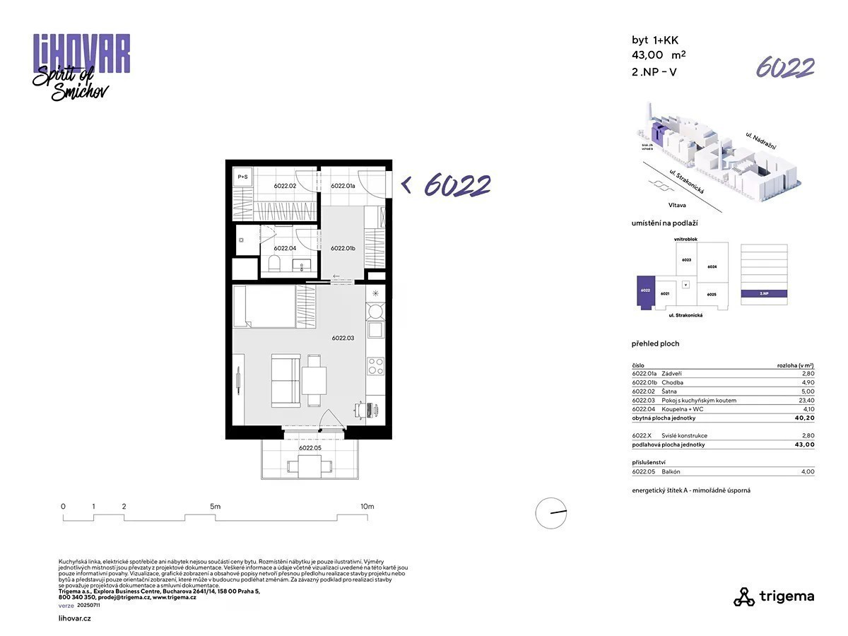 Staňte se součástí výjimečného projektu! Smíchov se mění - a vy můžete být u toho. Třetí a zároveň poslední etapa výjimečného projektu uzavírá vznik nové čtvrti, kde se industriální styl snoubí s moderní architekturou. Na místě vyroste živý prostor plný obchodů, služeb a kulinářských zážitků v rámci rozsáhlého food courtu. Nový Dvorecký most propojí Smíchov s Podolím a rekonstrukce Smíchovského nádraží dodá celé lokalitě ještě větší hodnotu. Prémiové byty od renomovaného developera Trigema ve vyšších patrech nabídnou neopakovatelné výhledy na Vltavu, Vyšehrad a Pankrác. Poslední šance stát se součástí místa, které definuje budoucnost této části Prahy. Praktické 1+kk s balkonem a šatnou Byt č. 6022 o dispozici 1+kk a celkové podlahové ploše 43,00 m2 se nachází ve 2. nadzemním podlaží a je orientovaný na východ, což zaručuje klidná a prosvětlená rána. Obytná plocha činí 40,20 m2, doplněná o balkon o velikosti 4,00 m2. • Samostatná šatna jako praktický úložný prostor • Kompaktní dispozice a výborně řešený interiér • Balkón orientovaný na východ • Energetická třída A - mimořádně úsporná O pohodlí se starají moderní technologie - rekuperace, stropní chlazení, exteriérové žaluzie či izolační trojskla. Vše je řízeno chytrým systémem Loxone, který zajišťuje příjemné a úsporné bydlení v každém ročním období. Byty v LIHOVARU jsou navrženy pro maximální komfort a praktičnost. Každý byt má vlastní terasu nebo lodžii. Promyšlené dispozice přinášejí dostatek světla a vzdušnost, přičemž ideální domov tu najde jak náročný singl, tak rodina s dětmi. Fotografie interiéru jsou pouze referenční. Pro prohlídku nemovitosti kontaktujte makléře společnosti. Nabídka dalších bytů na stránkách developerského projektu.