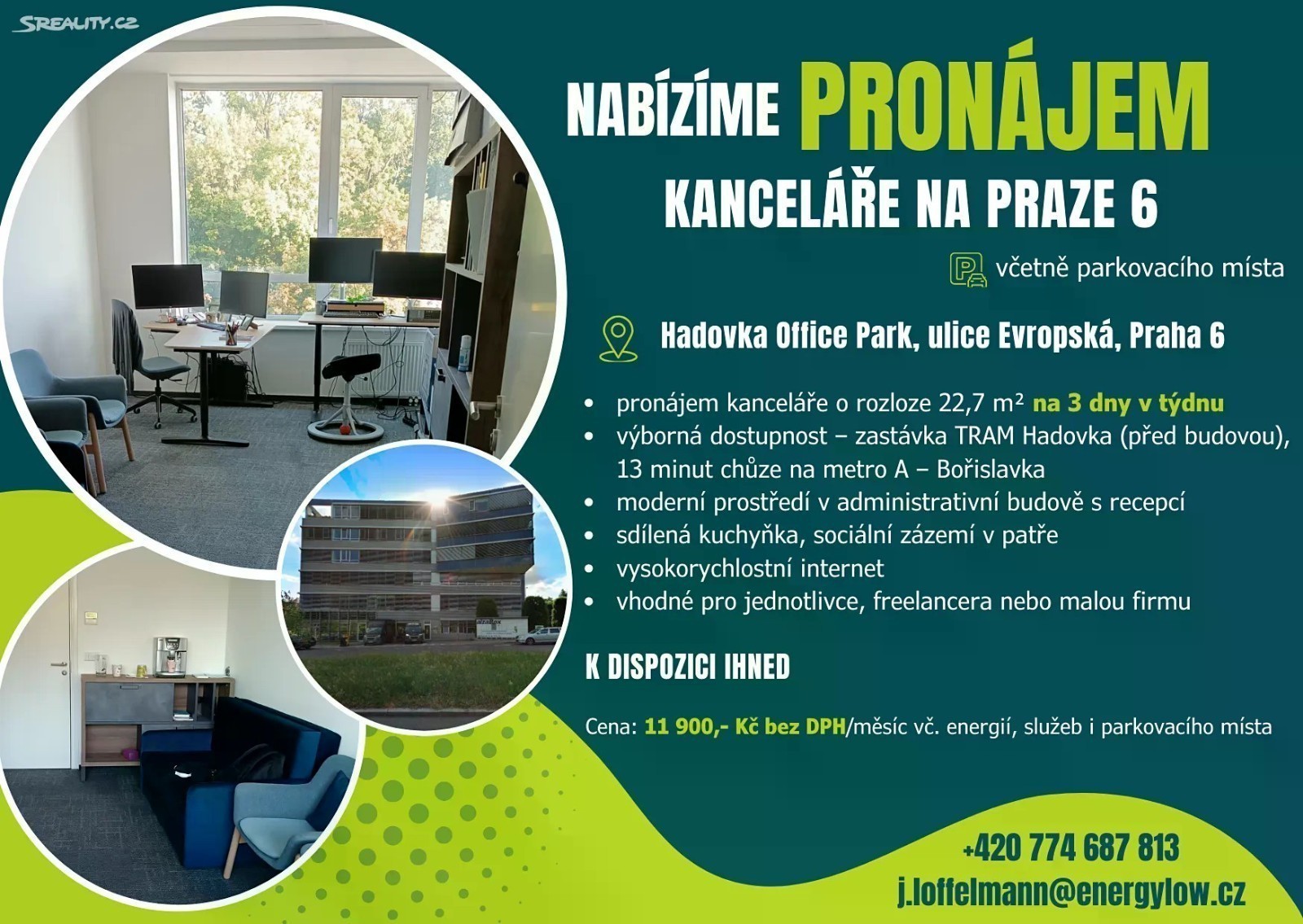 Nabízíme pronájem kanceláře na Praze 6, včetně parkovacího místa v garáži na adrese Hadovka Office Park, ulice Evropská. Pronájem kanceláře o rozloze 22,7 m² na 3 dny v týdnu. Výborná dostupnost - zastávka TRAM Hadovka (před budovou), 13 minut chůze na metro A - Bořislavka. Moderní prostředí v administrativní budově s recepcí. Sdílená kuchyňka, sociální zázemí v patře. Vysokorychlostní internet. Vhodné pro jednotlivce, freelancera nebo malou firmu. K DISPOZICI IHNED. Cena: 9 900,- Kč bez DPH/měsíčně vč. energií, služeb i parkovacího místa.