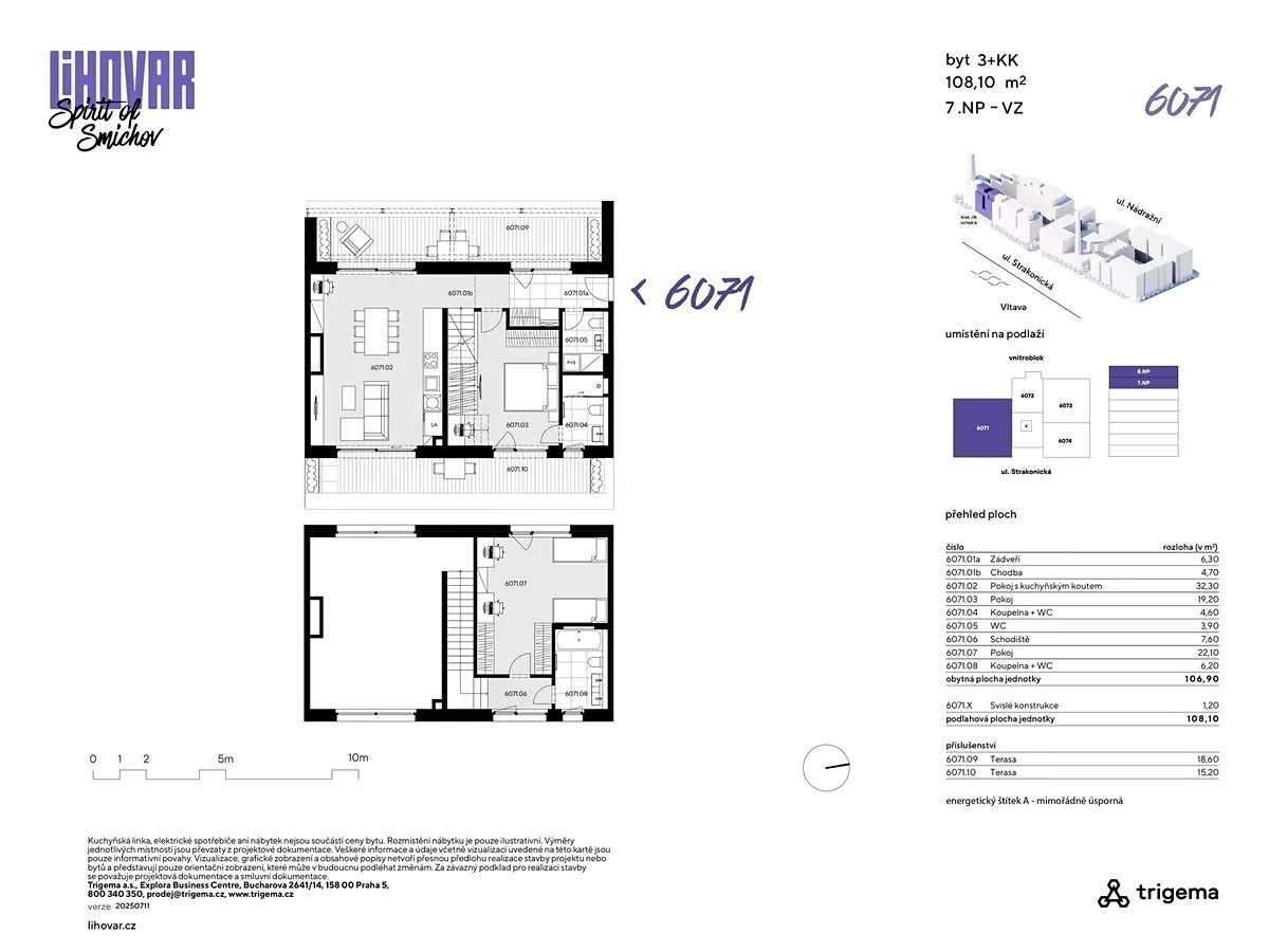Staňte se součástí výjimečného projektu! Smíchov se mění - a vy můžete být u toho. Třetí a zároveň poslední etapa výjimečného projektu uzavírá vznik nové čtvrti, kde se industriální styl snoubí s moderní architekturou. Na místě vyroste živý prostor plný obchodů, služeb a kulinářských zážitků v rámci rozsáhlého food courtu. Nový Dvorecký most propojí Smíchov s Podolím a rekonstrukce Smíchovského nádraží dodá celé lokalitě ještě větší hodnotu. Prémiové byty od renomovaného developera Trigema ve vyšších patrech nabídnou neopakovatelné výhledy na Vltavu, Vyšehrad a Pankrác. Poslední šance stát se součástí místa, které definuje budoucnost této části Prahy. Luxusní 3+kk se dvěma terasami a výhledem Byt č. 6071 o dispozici 3+kk a celkové podlahové ploše 108,10 m² se nachází v 7. nadzemním podlaží a je orientován na východ a západ, což zaručuje ideální světelné podmínky po celý den. Obytná plocha činí 106,90 m², doplněná o dvě terasové plochy (18,60 m² a 15,20 m²) - ideální pro relaxaci i společenské aktivity. • Dvě koupelny, samostatné WC a výborná dispozice • Dvě terasy s východní a západní orientací • Nadstandardní plocha a pohodlí • Energetická třída A - mimořádně úsporná O pohodlí se starají moderní technologie - rekuperace, stropní chlazení, exteriérové žaluzie či izolační trojskla. Vše je řízeno chytrým systémem Loxone, který zajišťuje příjemné a úsporné bydlení v každém ročním období. Byty v LIHOVARU jsou navrženy pro maximální komfort a praktičnost. Každý byt má vlastní terasu nebo lodžii. Promyšlené dispozice přinášejí dostatek světla a vzdušnost, přičemž ideální domov tu najde jak náročný singl, tak rodina s dětmi. Fotografie interiéru jsou pouze referenční. Pro prohlídku nemovitosti kontaktujte makléře společnosti. Nabídka dalších bytů na stránkách developerského projektu.