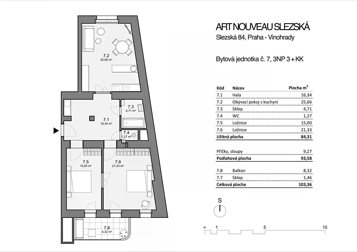 Byt aktuálně v předrezervaci Byt 3+kk v rezidenci Art Nouveau Slezská | 94m2 + balkon 8m2 | Praha 3 - Vinohrady Nabízíme nadčasový, elegantní byt s dispozicí 3+kk o podlahové ploše 94 m2 s balkonem 8m2, situovaný ve 3. NP, který spojuje krásu secesního domu se současnými standarty včetně výtahu. Rezidenci Art Nouveau Slezská se nachází v jedné z nejvyhledávanějších pražských lokalit, jen pár kroků od náměstí Jiřího z Poděbrad. K bytu náleží sklep (1,5 m2) a je zde možnost zakoupení parkovacího stání přímo v domě. V čem je byt jedinečný? - Promyšlená dispozice s variabilitou pro různé životní situace. Vstupní hala s dostatkem úložného prostoru rozděluje byt na klidovou a společenskou zónu - na straně do ulice se nachází prostorný obývací pokoj s kuchyňským koutem, na opačné straně pak dvě neprůchozí ložnice. Jednu z nich lze využít jako pracovnu, dětský pokoj nebo šatnu. - Vynikající orientace a prosvětlení: Byt je příčně provětrávaný se severo-jižní orientací s ložnicemi situovanými do tichého vnitrobloku. - Vysoký standard: Dům i byt prošly nadstandardní rekonstrukcí - kuchyňská linka se spotřebiči Siemens a De Dietrich, koupelna s hydromasážní vanou a podlahovým vytápěním, v ložnicích předokenní elektrické rolety. - Slunný balkon (8 m2) orientovaný na jih do zeleného vnitrobloku. Nabízí dostatek soukromí a příjemné posezení pro ranní kávu, odpolední relax i grilování s přáteli. - Možnost přikoupení garážového stání přímo v domě Lokalita Vinohrad je jednou z nejprestižnějsích pražských čtvrtí, nabízí klidné bydlení i společenský život v blízkosti Čechových sadů, Bezručových sadů, Riegrových sadů, Havlíčkových sadů. Plná občanská vybavenost včetně škol, školek, oblíbených kaváren, restaurací, barů a farmářských trhů na náměstí Jiřího z Poděbrad. Skvělá dopravní dostupnost metrem i tramvají. Pro více informací nebo domluvení prohlídky nás neváhejte kontaktovat. Tento byt v srdci Vinohrad si zamilujete.