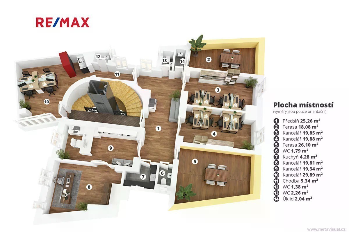 Exkluzivně nabízíme k podnájmu kancelářské prostory na Staroměstském náměstí. Exteriér i interiér budovy je vkusně zrekonstruován včetně vybavení klimatizace a nábytku typu vestavěných skříní a polic. Kancelářské prostory jsou přístupné bezbariérově díky umístění výtahu uvnitř budovy. Vytápění zajišťuje dvojice plynových kotlů, díky kterým horká voda hřeje v teplovodních radiátorech v každé místnosti a chodbách. Dispozice kancelářských prostor: - předsíň (25 m²) - terasa č. 1 (18 m²) - kancelář č. 1 (20 m²) - kancelář č. 2 (20 m²) - terasa č. 2 (26 m²) - toaleta č. 1 (2 m²) - kuchyň č. 1 (4 m²) - kancelář č. 3 (20 m²) - kancelář/ recepce (19 m²) - kancelář č. 4 (30 m²) - chodba (5 m²) - toaleta č. 2 (1,5 m²) - toaleta č. 3 (2 m²) - technická místnost (2 m²) Náklady: - výše záloh za služby 10.000,- Kč - přepis energií na podnájemníka dle domluvy - odměna RK ve výši 1 nájmu Pokud Vás zaujala tato nabídka, neváhejte mne kontaktovat. Budu se na Vás těšit na prohlídce.