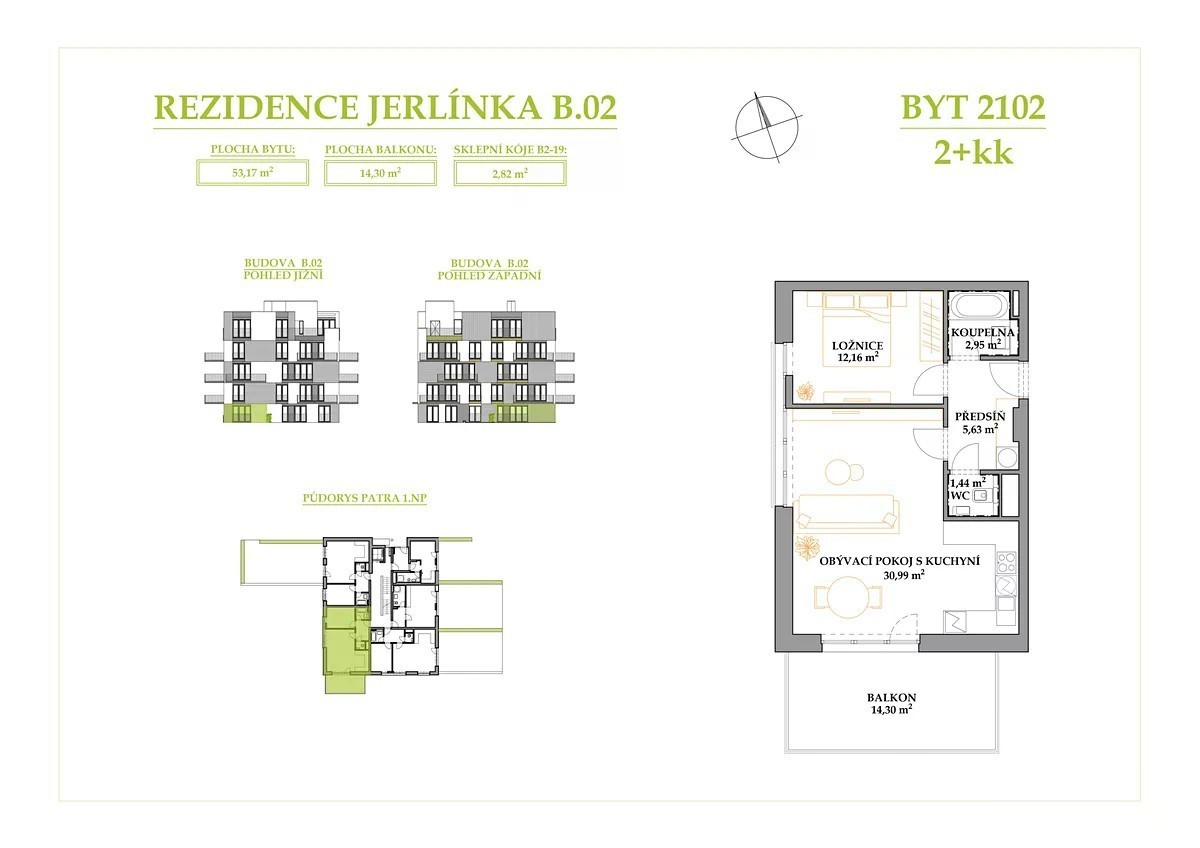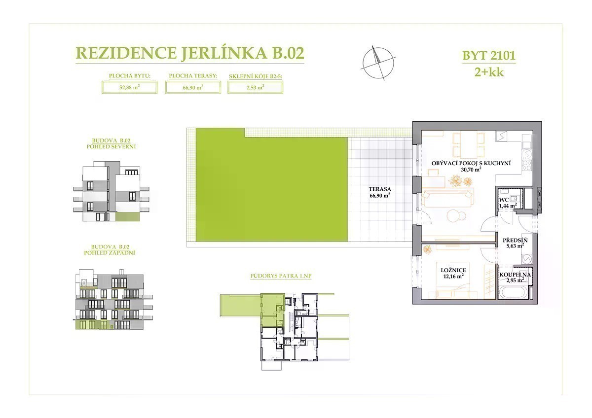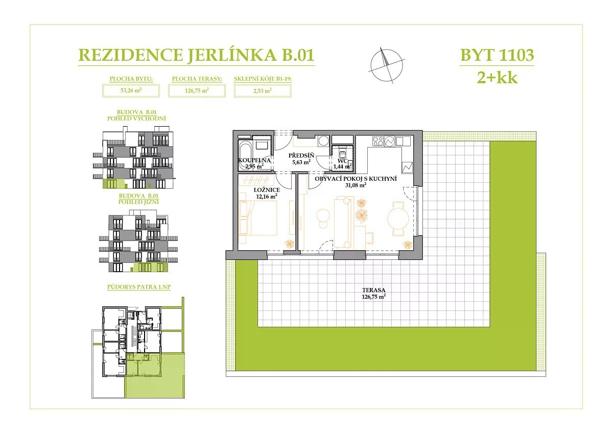 Představujeme Vám nový projekt Rezidence Jerlínka, který je obklopen krásnou přírodou. Inspirací pro náš projekt je Jerlín japonský, majestátní listnatý strom, představující sílu a klidný život v souladu s přírodou. Nabízíme byt ke koupi, přímo od developera. Ve standardu je: - podlahové vytápění - klimatizace všech obytných místnostech - hybridní podlaha - venkovní žaluzie - prostorné terasy a balkóny - sklepní kóje v ceně bytu - trojskla Byt o dispozici 2+kk se nachází ve 1. NP bytového domu č. 1 o podlahové ploše 53,26 m2. V bytě je prostorný obývací pokoj s obytnou kuchyní a přístupem na terasu o velikosti 126,75 m2, ze všech pokojů. Dále jednotka nabízí prostornou ložnici, předsíň, koupelnu a samostatné WC. K bytu je v ceně přiřazena sklepní kóje, která se nachází v suterénu objektu. Termín kolaudace březen 2027. Přikoupit lze i parkovací místo, parkovací místo se skladem či uzavíratelnou garáž. Pro více informací nás neváhejte kontaktovat.