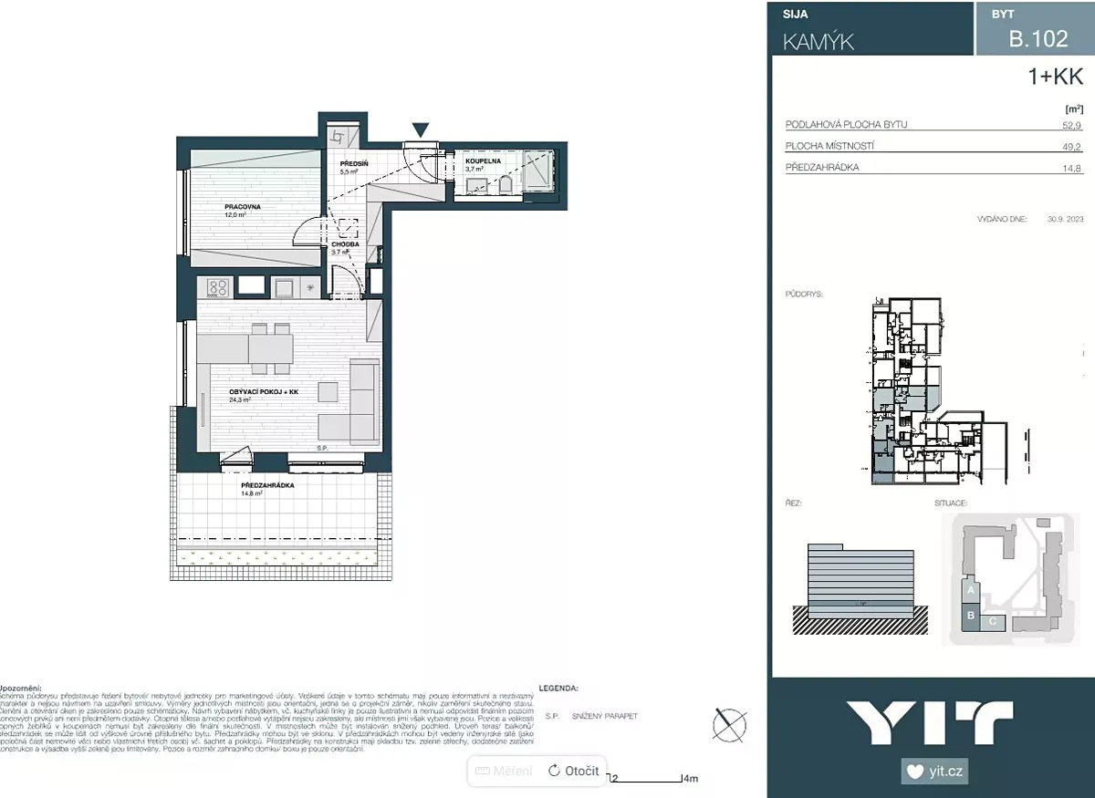 Byt je plně vybaven nábytkem a kuchyňskou linkou vč. spotřebičů. Byt 1/2+kk o celkové rozloze 52,9 m2 s předzahrádkou 14,8 m2 je situován v 1.NP projektu SIJA Kamýk. Cena zahrnuje bytovou jednotku, sklepní kóji a DPH. Cena bytu obsahuje kompletní interiérové vybavení. V oblíbené části Prahy 12 pro vás stavíme nový projekt SIJA Kamýk se 122 byty ve finském stylu. Vybírat můžete z pestré nabídky jednotek o dispozicích 1+kk až 4+kk a velikostech od 30 do 116 m2. Součástí většiny bytů jsou i balkony, terasy či předzahrádky. V rámci projektu nebude chybět kočárkárna, garážová parkovací stání a také sklepní kóje. Rodinné chvilky pohody lze trávit v klidném vnitrobloku. Soukromá část přístupná jen rezidentům nabídne příjemné posezení a prostor pro mytí kol či psů. Tu veřejnou s parkem během výstavby zrevitalizujeme a vysázíme zde novou zeleň. Plánujeme také opravit chodníky a zřídit workout zónu či nové dětské hřiště. Nezapomínáme ani na občanskou vybavenost - proto v projektu vybudujeme 4 komerční prostory, kde mohou vzniknout drobné obchody a služby. Projekt roste na rohu ulic Hodkovická a Mariánská, v městské části Praha-Kamýk s klidnou atmosférou a vším potřebným po ruce. Bytovému domu ve tvaru písmene „L“, o 2 podzemních a 10 nadzemních podlažích (s posledním ustupujícím), dominuje výrazný nárožní arkýř, jehož stěna podél hlavní ulice bude dále členěna balkony. Návrh, o nějž se postaralo studio AGE project, se nese v elegantním a nadčasovém severském stylu a plynule navazuje na okolní zástavbu.