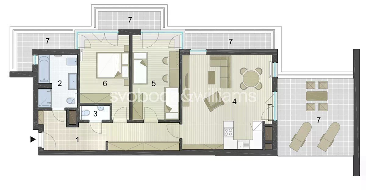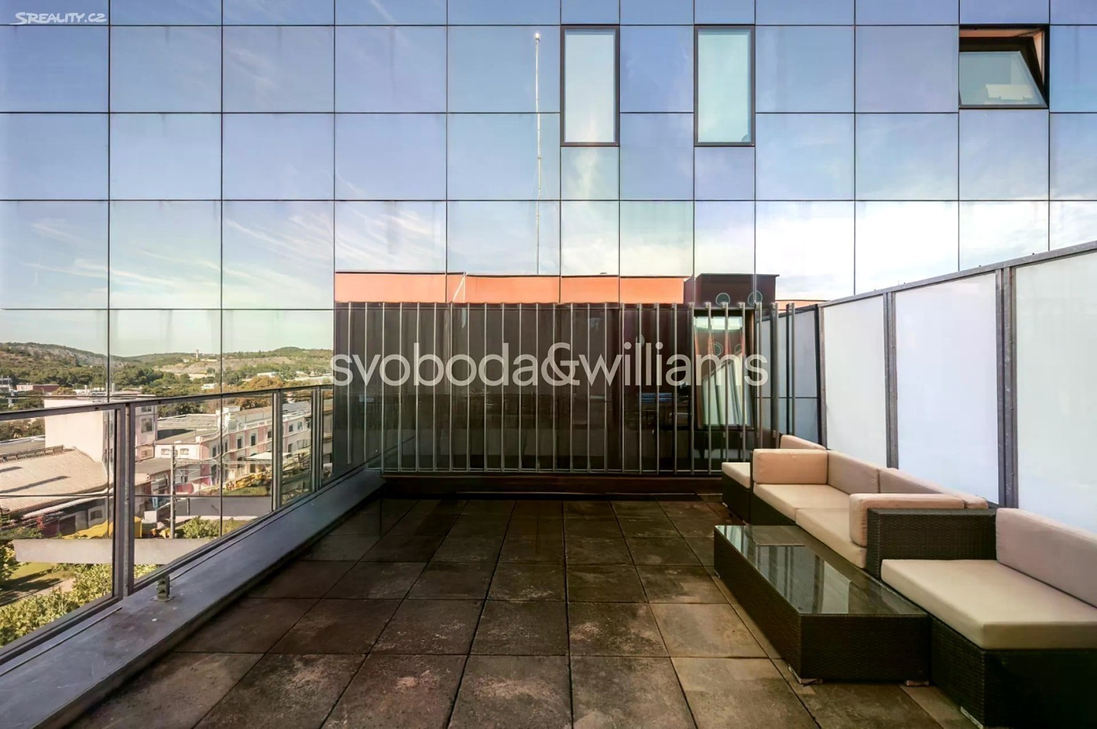 Zařízený klimatizovaný byt se čtyřmi terasami je umístěn v nejvyšším podlaží rezidenčního projektu v příjemné části Prahy 6 - Bubenči v blízkosti Stromovky. Dispozici tvoří obývací pokoj s kuchyní a vstupem na prostornou hlavní terasu, 2 ložnice s vlastními terasami, koupelna (s oknem, vanou, sprchovým koutem a WC), samostatná toaleta a vstupní hala. Z oken se otevírají výhledy, například na zoologickou zahradu nebo vinici sv. Kláry. Interiér byl realizován dle návrhu bytového designéra, k vybavení patří klimatizace, dřevěné podlahy, velkoformátová keramická dlažba a obklady, francouzská okna (směrem k železniční trati mají dvojitá protihluková skla), na míru vyrobený vestavěný nábytek, plně vybavená kuchyně se žulovou pracovní deskou a spotřebiči Siemens a bezpečnostní vstupní dveře Next. Interiér poskytuje dostatek úložných prostor, k jednotce navíc náleží komora na patře nahrazující sklep. V případě zájmu je možné byt přenechat s veškerým interiérovým vybavením. Oblast nabízí plnou občanskou vybavenost a výbornou dopravní dostupnost centra Prahy tramvají i vlakem. Autem se lze rychle napojit na tunelový komplex nebo dojet na letiště, blízko domu vede bezpečná cyklostezka, po níž je možné se dostat až do centra. V blízkosti fungují státní i soukromé školy a školky, sportovní areál s tenisovými i volejbalovými kurty nebo indoorové golfové hřiště. Okolí je plné dětských hřišť, jen pár kroků vede do Stromovky. Podlahová plocha 94,1 m2, terasy celkem 45,6 m2, komora 3,1 m2.