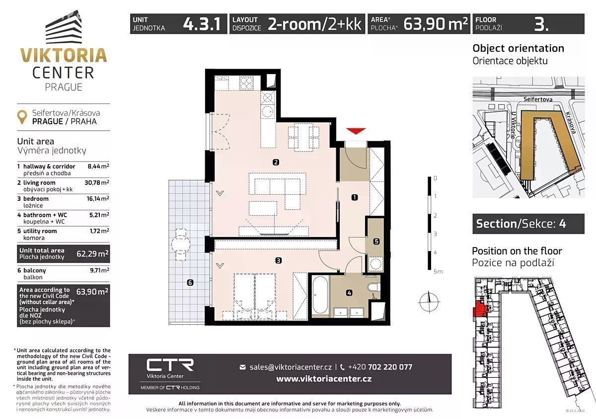 Home Real Estate v zastoupení vlastníka nabízí k prodeji plně vybavený byt 2+kk o podlahové ploše 67,1 m², který se nachází v 6. nadzemním podlaží exkluzivního projektu Viktoria Center. Byt je orientován na západ a nabízí nádherný výhled na Pražský hrad. K bytu náleží prostorný balkon o výměře 10 m² a sklepní kóje v suterénu budovy. Součástí nabídky je možnost dokoupení dvojitého garážového stání pro dva vozy za cenu 1.690.000 Kč. Byt je vybaven dřevěnými francouzskými okny s elektricky ovládanými venkovními žaluziemi, vícevrstvou dřevěnou podlahou s podlahovým vytápěním a lakovanými interiérovými dveřmi v nadstandardní výšce 2,1 m. Koupelna je osazena sanitou značky Laufen Pro. Samozřejmostí jsou moderní datové rozvody pro vysokorychlostní internet, digitální i satelitní televizi. Viktoria Center je prestižní rezidenční projekt od renomovaného developera CTP, který nabízí celkem 180 bytů navržených s důrazem na kvalitu, funkčnost a pohodlí moderního městského bydlení. Projekt vychází z konceptu města krátkých vzdáleností a tradiční blokové struktury, jakou známe z Vinohrad, Dejvic či Žižkova. V bezprostředním okolí naleznete veškerou občanskou vybavenost, obchody, restaurace, kavárny, služby, supermarket či drogerii přímo v areálu. Výborná dopravní dostupnost - na Václavské náměstí nebo stanici metra se dostanete za pouhých 5 minut. Pro více informací a sjednání prohlídky kontaktujte makléře nebo vyplňte formulář níže. Rádi se Vám budeme věnovat.